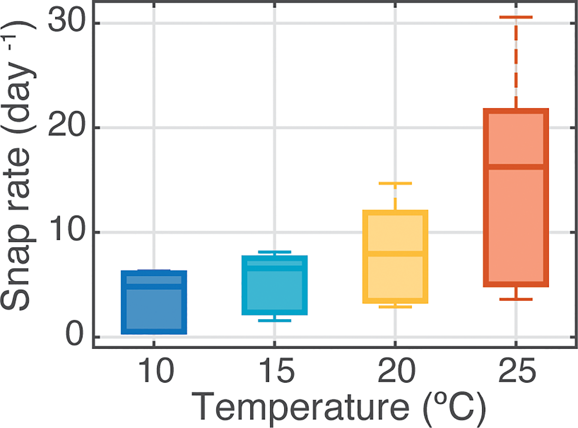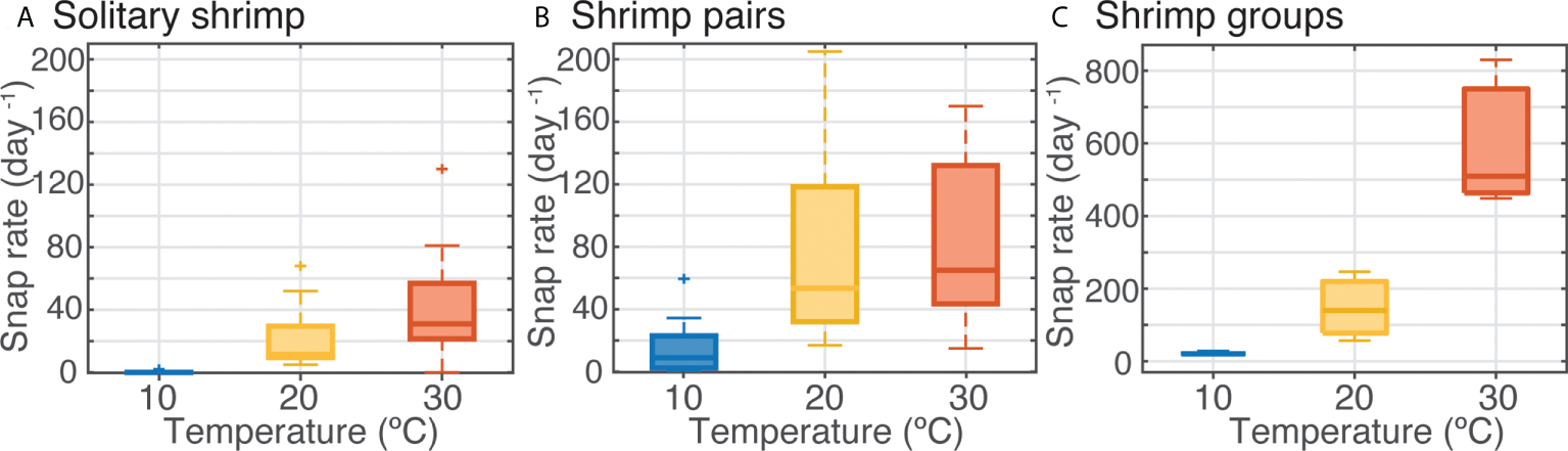 Experiment 1 showed that single shrimps maintained solitarily generated, on average, over three times more snaps per day at 25°C than at 10°C (Figure 3). Variability in snap emission rates among replicate shrimp was also highest within the elevated temperature treatments (Figure 3). In Experiment 2, in which the range of temperature was expanded to 30 °C and shrimp responses tested under different behavioral conditions, water temperature continued to show a substantial influence on snap rate for shrimp maintained both individually and in pairs (Figures 4A, B). Species was not found to be a significant factor for snap rate, in concordance with previous studies using these closely related species (Lillis et al., 2017), and therefore these data are presented as pooled results for the two species. Non-parametric Welch’s ANOVAs indicated a significant effect of temperature treatment on snap rates (solitary: F2,25 = 30.5, p<0.0001, n=20 per treatment; pairs: F2,26 = 23.4, p<.0001, n=18 per treatment). For shrimp held solitarily, snap rates were significantly lower at 10°C, with only one solitary shrimp producing a single snap detection compared to a median of 31 snaps day-1 for shrimp at 30°C (Figure 4A). While all pairs of shrimp did exhibit non-zero snap rates, at the 10 °C temperature treatment median snap rates were more than 7-fold lower than for pairs at 30°C (Figure 4B). Pair snap rate also showed high variability at both mid-range and high temperatures. In Experiment 3, where mixed-sex groups of 10 shrimp were held in mesocosms, median snap detections were 21, 140, and 510 snaps/day in the 10, 20, and 30°C treatments, respectively (Figure 4C). Log-transformed data for the groups of shrimp met the assumptions for an ANOVA, therefore, a linear mixed model (repeated measures) was applied to control for random effects of group and trial number (repeated measure and randomized block respectively). This test found that there was a statistically significant effect of temperature on group snap count (F1,7 = 96.8, p<.0001).