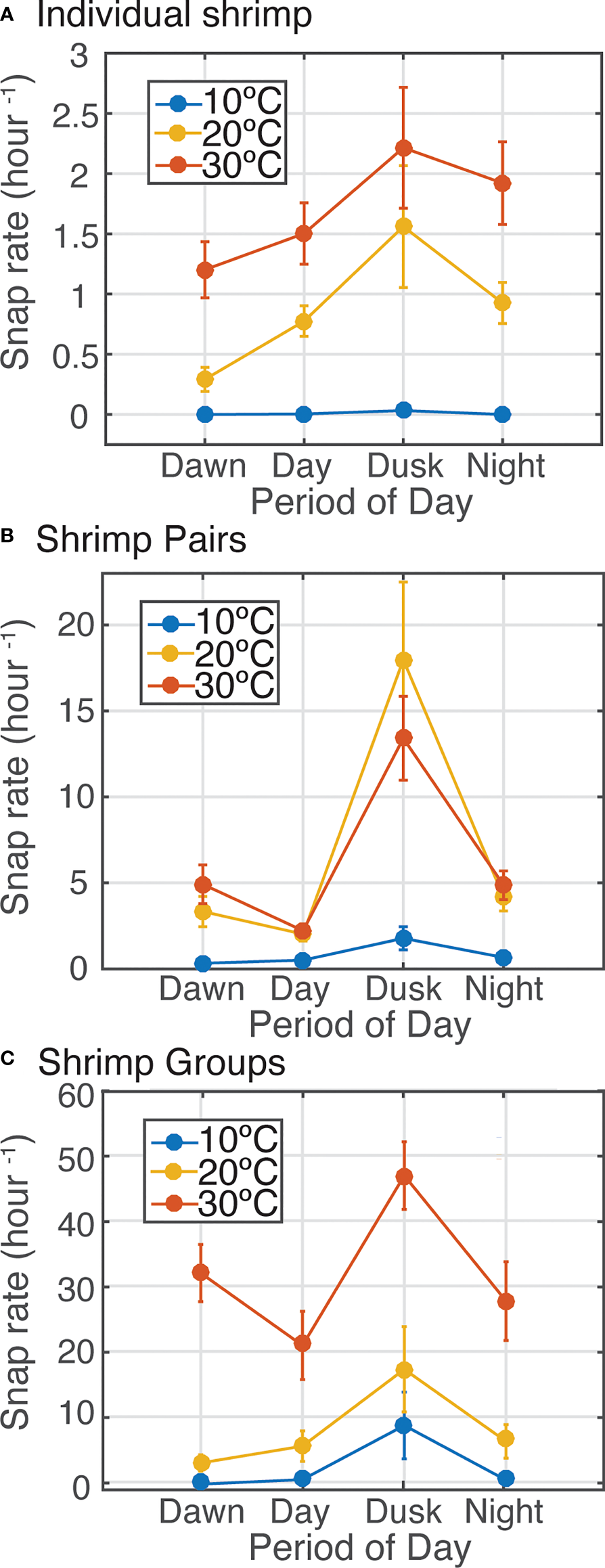 Examining snap production throughout the diel cycle revealed that shrimp acoustic output varied by time of day, but this pattern was modulated by temperature and behavioral context (Figure 5). Dawn and dusk periods are the time of day when snapping shrimp populations are observed to be most acoustically active in soundscape recordings (Radford et al., 2008; Radford et al.,2010; Lillis et al., 2017; Lillis and Mooney 2018). For all laboratory trials, within all treatments, snap rate was highest during dusk periods (Figure 5), except for individual shrimp, which did not snap under low temperatures (Figure 5A). It is evident that crepuscular snapping primarily drives the overall influence of temperature on snap rate, particularly when shrimp are held together as male-female pairs or mixed sex groups.
