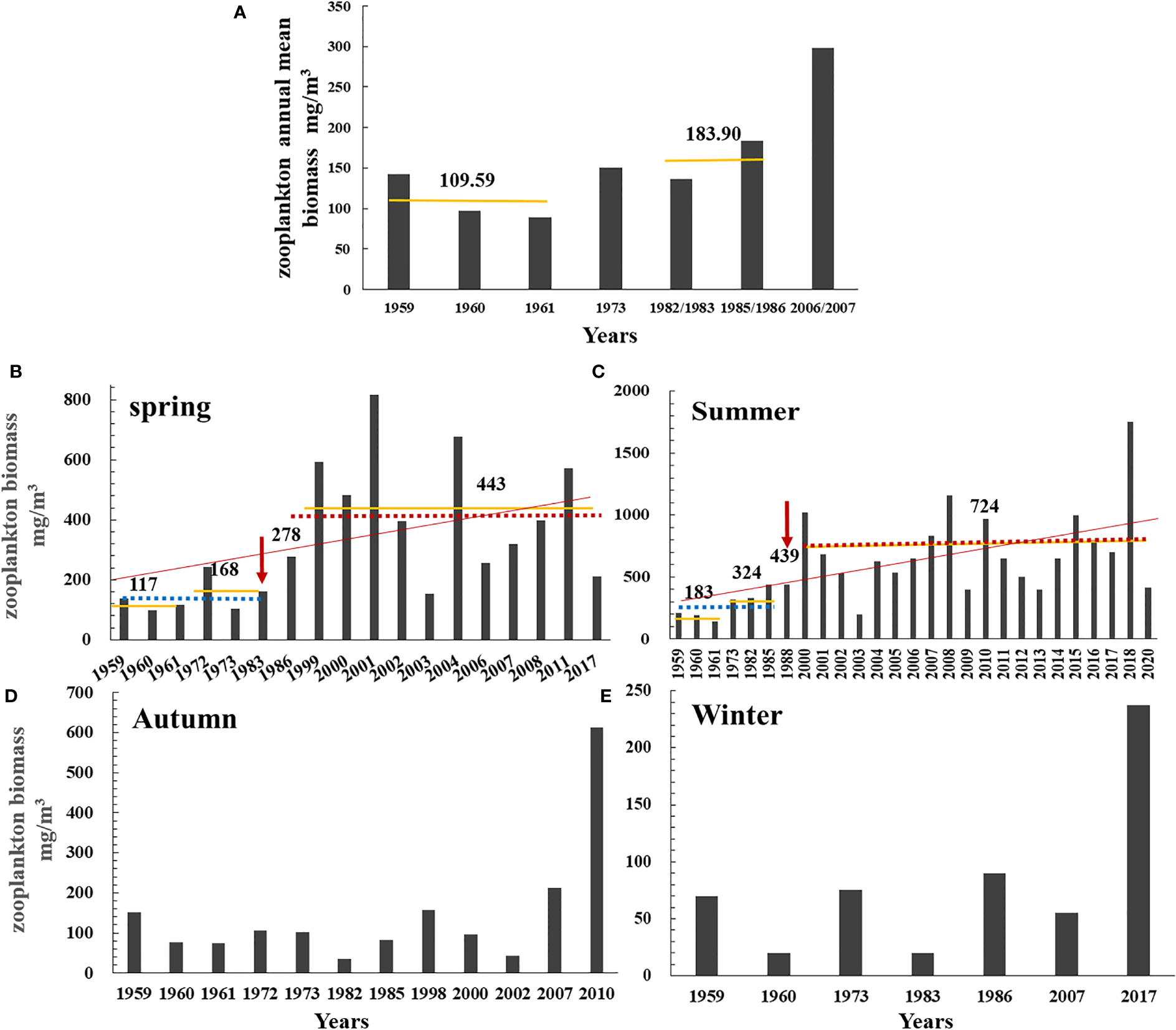 The annual mean biomass of zooplankton from 1959 to 2007 (A) and zooplankton biomass in spring from 1959 to 2017 (B), in summer from 1959 to 2020 (C), in autumn from 1959 to 2010 (D), and in winter from 1959 to 2017 (E) in the Changjiang estuary. Red line: trend line. Yellow line and the value above it: the mean biomass over a period. Red arrow: change point (breakpoint). Blue dotted line: mean biomass before breakpoint; red dotted line: mean biomass after breakpoint.