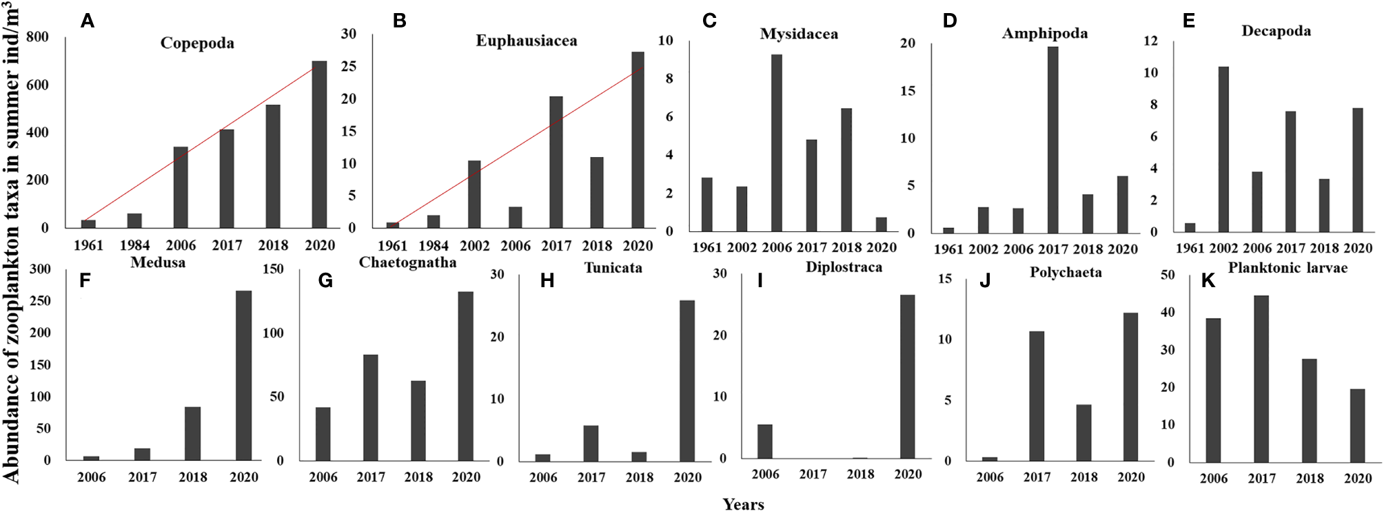 Abundance of Copepoda (A) and Euphausiacea (B) in summer in the 1960s, 1980s, 2000s, and 2010s; abundance of Mysidacea (C), Amphipoda (D), and Decapoda (E) in summer in the 1960s, 2000s, and 2010s; abundance of Medusa (including Hydrozoa and Ctenophora) (F), Chaetognatha (G), Tunicata (H), Diplostraca (I), Polychaeta (J), Planktonic larvae (K) in summer in the 2000s and 2010s. Red line: trend line. The different scales of the Y-axis are adjusted for different taxa abundances.
