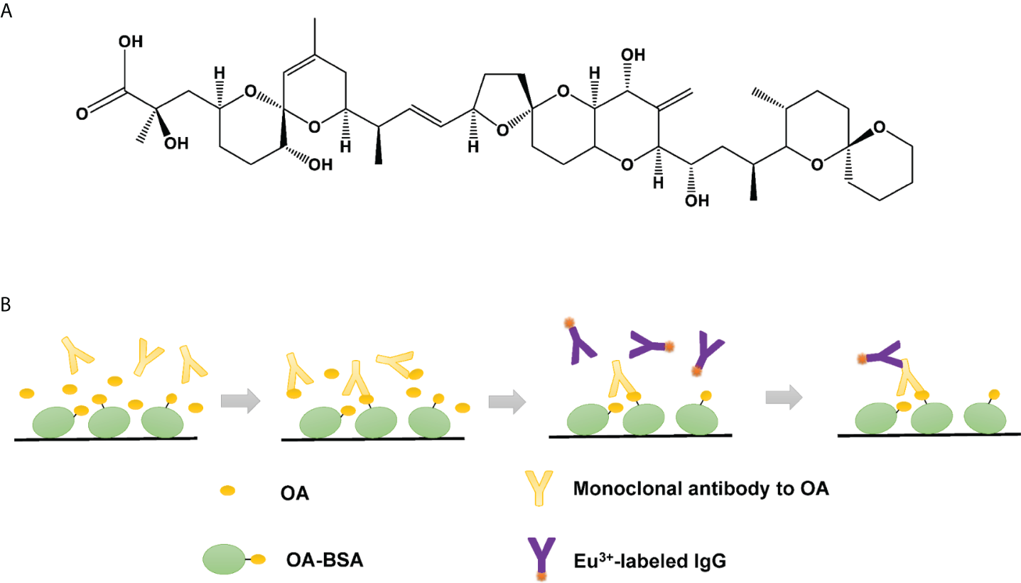 Time-resolved fluoroimmunoassay (TRFIA) is a kind of immunoassay that has been developed in recent decades. Rare-earth metal ions, Eu3+ and Sm3+, are used as labels because of their characteristics of high fluorescence intensity, ability to overcome high-background absorption, and long relaxation time (Wang et al., 2009; Huang et al., 2009; Zhang et al., 2011). TRFIA has been used for the detection of small molecules, such as salbutamol in the environment, aflatoxin b1 in feed, and oxyfluorfen in food, and has demonstrated excellent sensitivity and accuracy (Hu et al., 2018; Fang et al., 2019; Sheng et al., 2020). In this study, an OA detection method was developed using TRFIA on the basis of competitive immunization and applied this TRFIA method on shellfish.