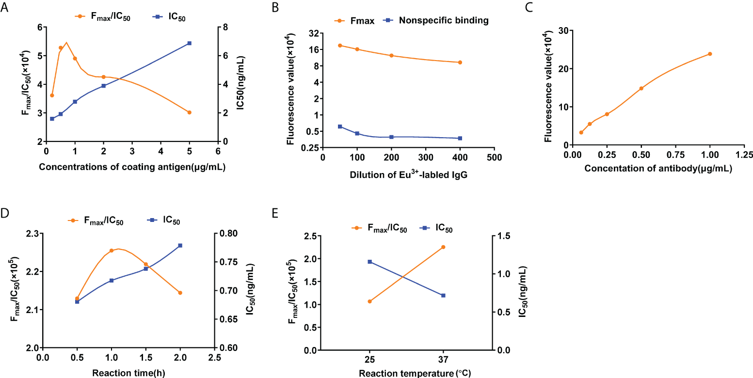 Optimization conditions of OA-TRFIA. (A) Fmax/IC50 values and IC50 values in different coating antigen concentration. (B) Maximum fluorescence values and non-specific binding fluorescence values at different Eu3+-labeled antibody concentrations. (C) Fluorescence valuesin different antibody concentrations. (D) Fmax/IC50 values and IC50 values in different incubation times. (E) Fmax/IC50 values and IC50 values in different incubation temperatures.