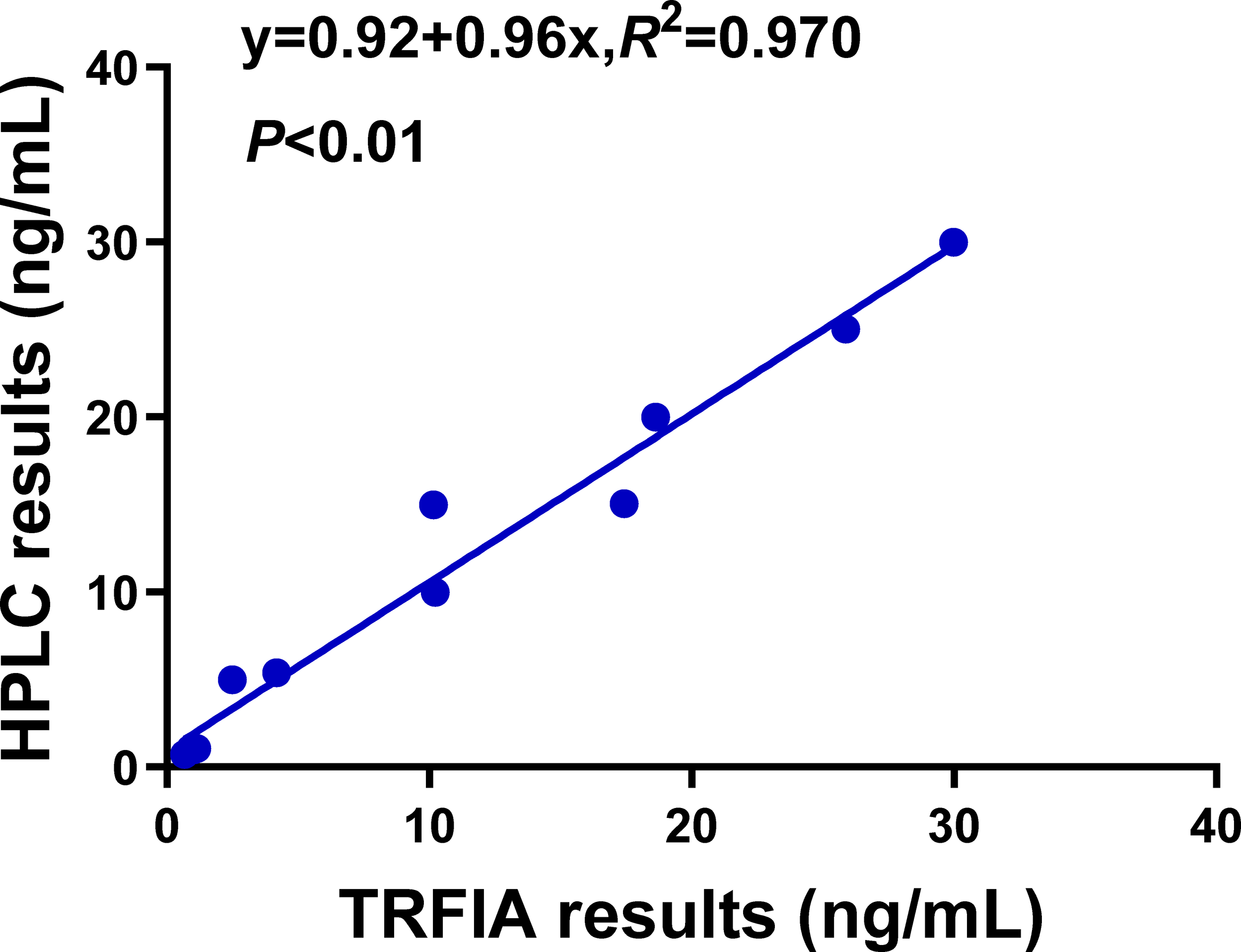 The TRFIA results were compared with the HPLC results and the correlation between them was calculated by IBM SPSS Statistics 26 (SPSS Inc., Chicago, IL, USA). Pearson correlation was used to analyze the correlation between variables and was statistically significant at P<0.05.