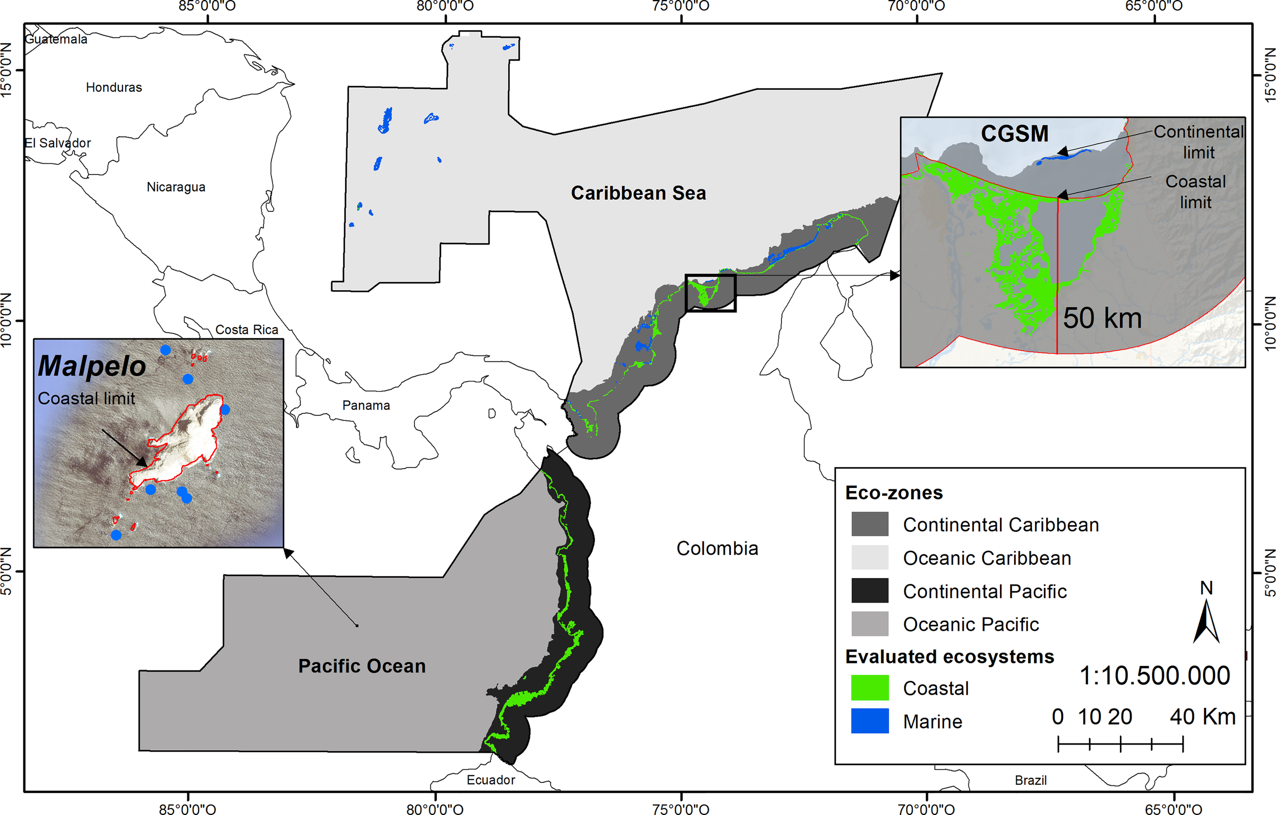 Study area. This map shows the four ecozones and the location of the evaluated coastal and marine ecosystems, including the mangrove coastal area of the Ciénaga Grande of Santa Marta and the marine ecosystem locations of Malpelo Island. The coastal limit (red line) encloses coastal environments, and the continental limit (200 m isobath) encloses continental ecozones.