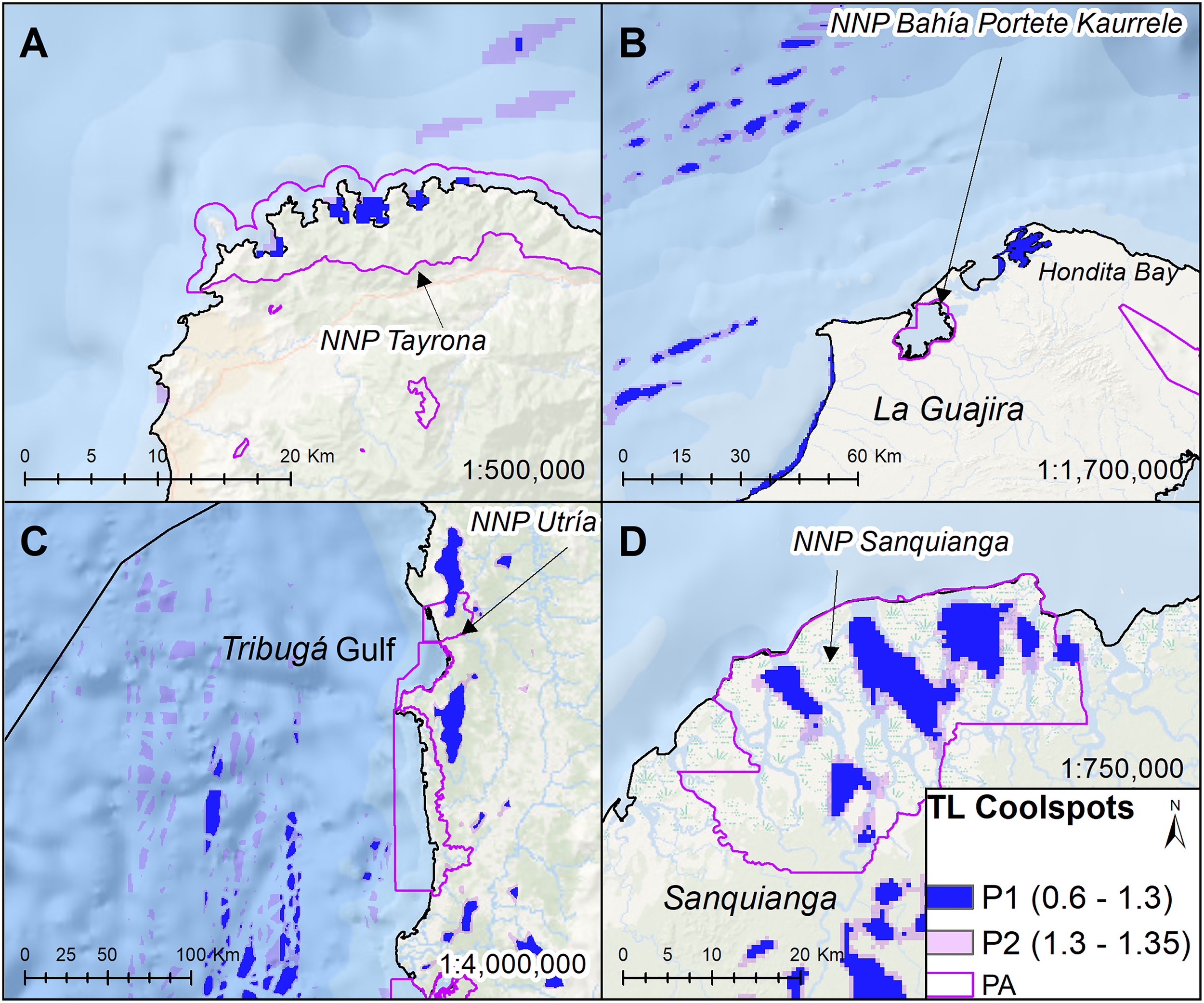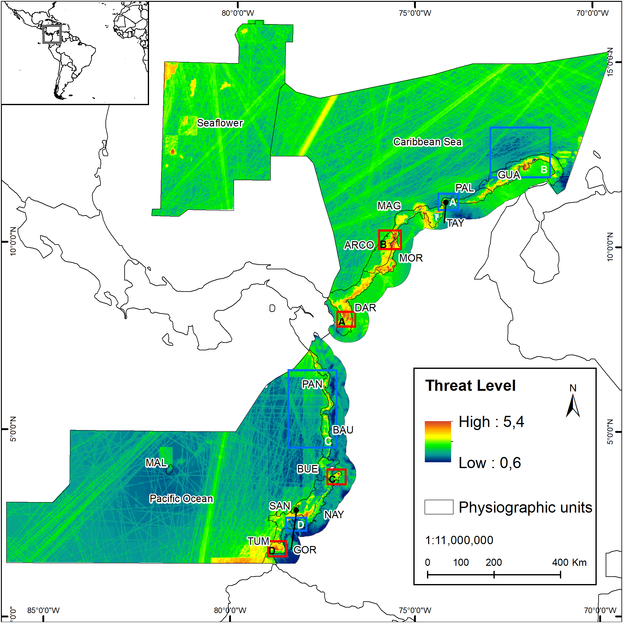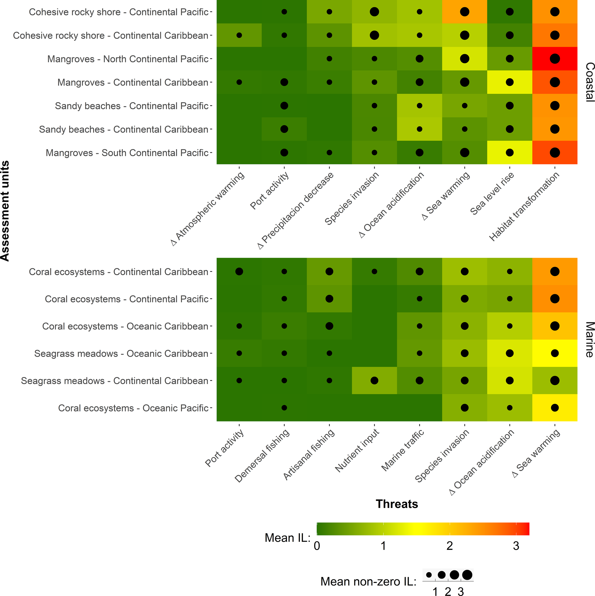 The observed TL patterns meet spatial expectations, revealing that the assessment units in the Caribbean Sea are more threatened than those in the Pacific Ocean, and continental areas are more threatened than the oceanic ones. Habitat transformation and sea warming were the threats with the most impact on coastal and marine ecosystems, respectively. Climatic threats were widely extended throughout the study area, occurring even in the most pristine zones (e.g., Malpelo Island).