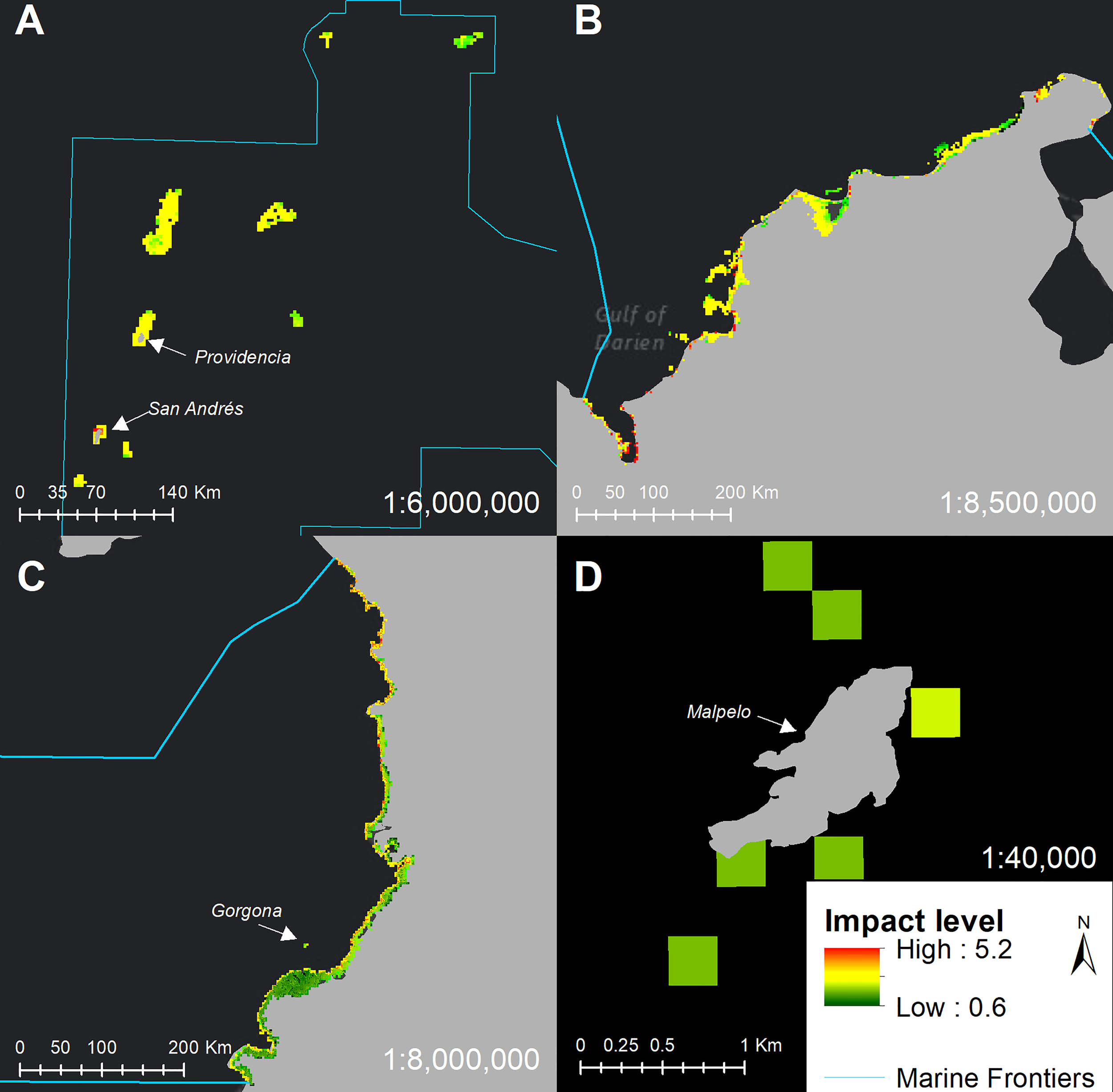 This study analyzes, for the first time, the extent of current anthropic and climatic threats with their impacts on Colombia’s marine and coastal ecosystems using the cumulative impact assessment framework. Employed impact maps identify ecosystems with high conservation concerns and in need of restorative action. Because threat analysis is essential to understand an ecosystem’s risk of collapse (Keith et al., 2013), this assessment constitutes the threat description component of the Red List of marine and coastal ecosystems (Uribe et al., 2020b), which is currently being developed synergistically with this research.