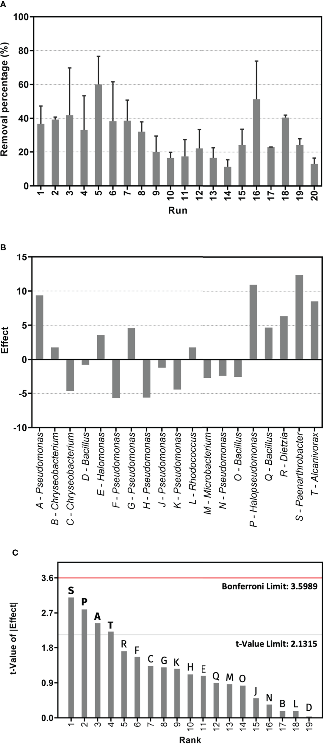 Results of PB experiment for light crude oil removal. (A) Percentage of crude oil removal for each bacterial culture run described in Table 2, measured by gravimetry after a 75-day incubation period. Error bars represent +/-1 standard deviation from the mean, n = 3. Run 20 corresponds to the abiotic control. (B) Standardized effects of PB design factors. (C) Pareto chart for PB design factors. Significant strains are in bold font. Rank (x-axis) corresponds to the factors, arranged in descending order according to the t-value of the absolute value of the effect.