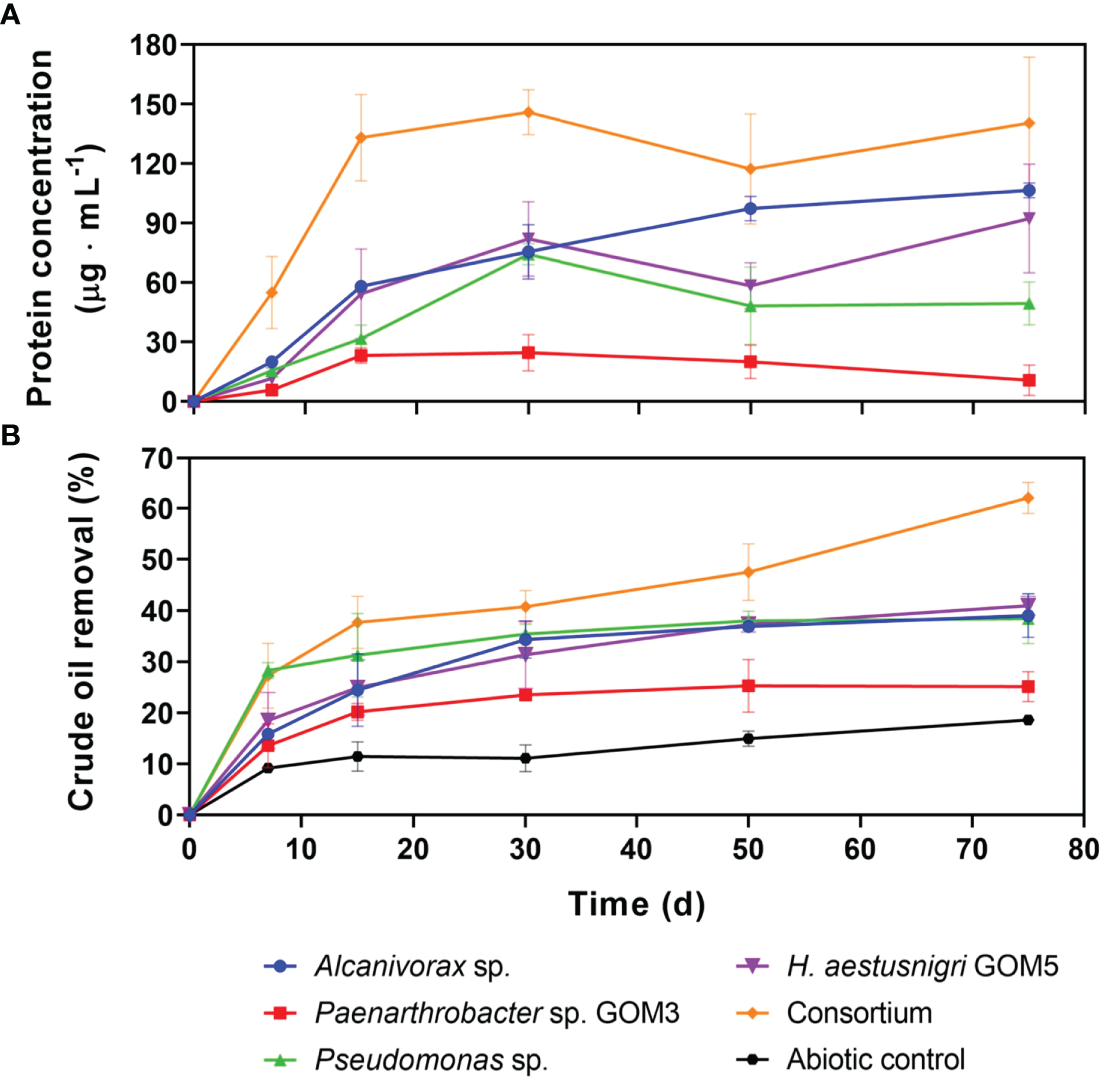 Each of the most significant isolates, determined by PB analysis, was grown individually, and in consortium, under the same culture conditions described in section 2.4 with an initial concentration of 1x108 CFU·mL-1 for each strain. For each sample, five culture sets were grown in triplicate to be used for total crude oil removal determination at days 7, 15, 30, 50, and 75. To monitor bacterial growth, one additional set of cultures was grown both with and without (negative control) crude oil; their protein content was measured with the Lowry method (Lowry et al., 1951) by taking 300-μL aliquots from each culture at the same five time points, plus a day 0 sample.