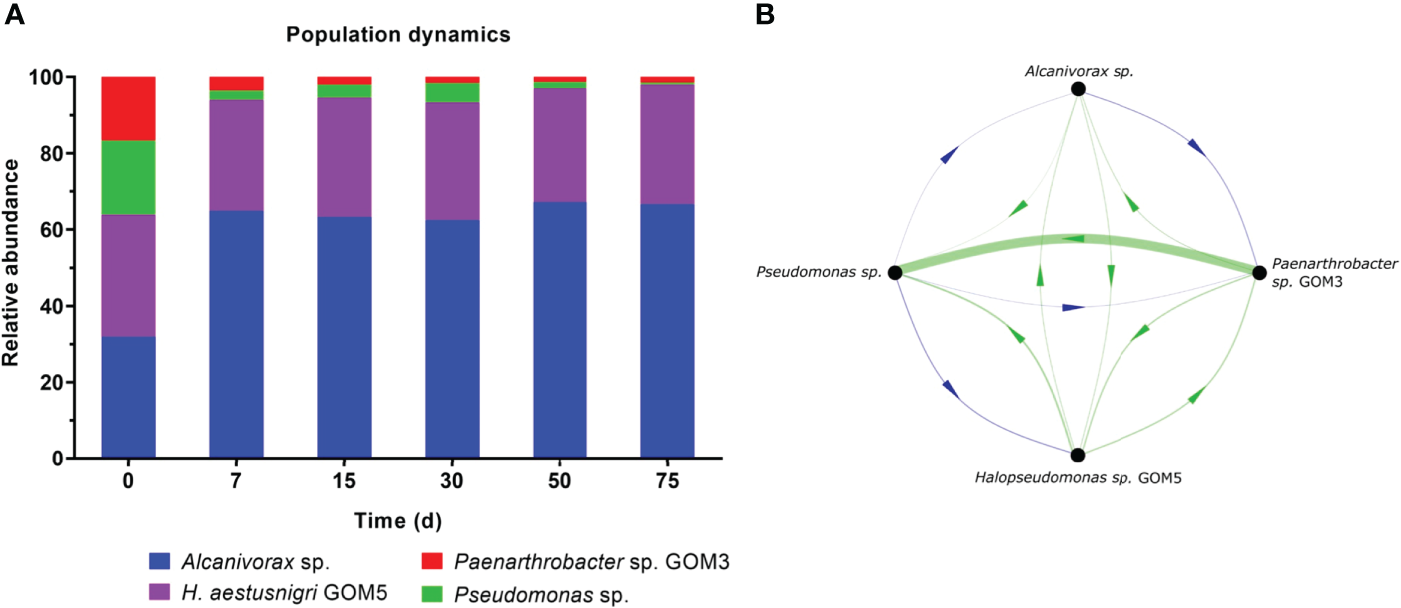We used the time-series Lotka-Volterra-based network inference approach, included in the MetaMIS software v1.02 (Shaw et al., 2016), to infer the underlying interactions of the consortium during crude oil biodegradation. In a nutshell, the software allows the time series data analysis of microbial community profiles. It systematically examines interaction patterns (such as mutualism or competition) and refines the biotic role within microbes, using default parameters.