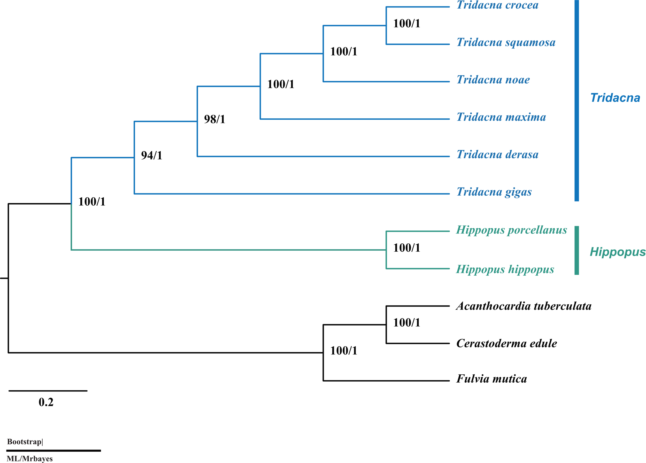 Eight Tridacninae species mitochondrial genomes (including one obtained in this study) and ribosomal gene sequences were used for phylogenetic analysis (Table 1). Three Cardiidae species were used as outgroups: Acanthocardia tuberculata (NC_008452.1), Cerastoderma edule (NC_035728.1), Fulvia mutica (NC_022194.1). The aligned gene matrices were concatenated for phylogenetic reconstruction using Maximum Likelihood (ML) and Bayesian analysis.