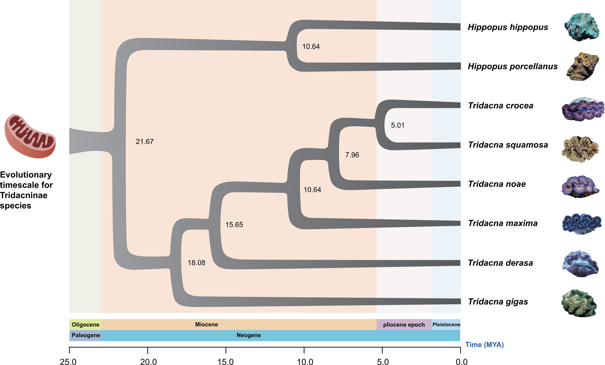 Evolutionary timescale for eight giant clam species inferred from a mitochondrial data set comprising 13 protein codons by mtDNA. Numbers at nodes indicate the mean estimated divergence times (in mya).