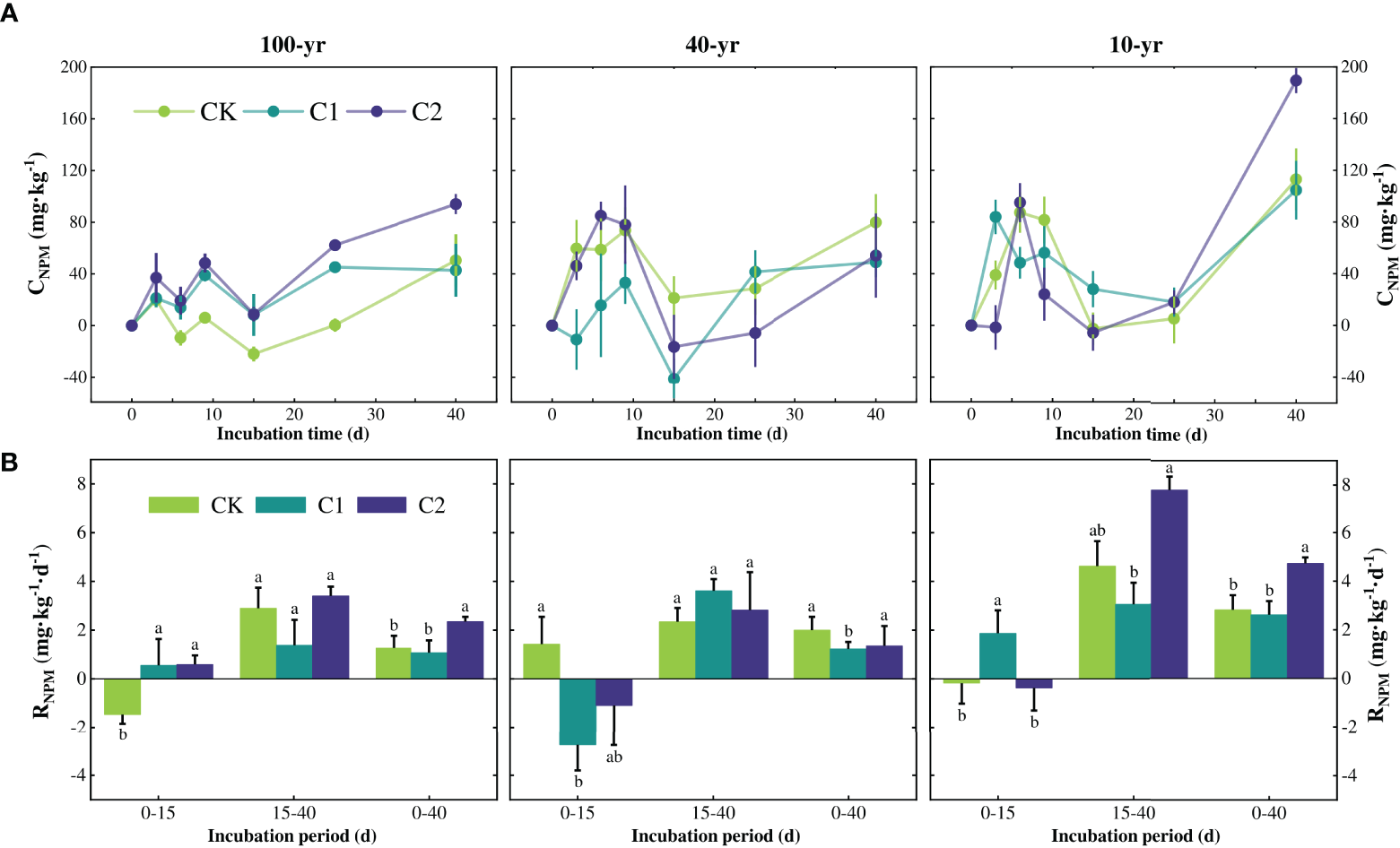 CNPM(A) and RNPM(B) in 100-year, 40-year, and 10-year reclaimed soils under the CK, low-dose Cd, and high-dose Cd treatments during 40 days of incubation. Lowercase letters indicate the significant differences among treatments of different Cd addition (P < 0.05). Data are means ± standard errors (mean ± SE).