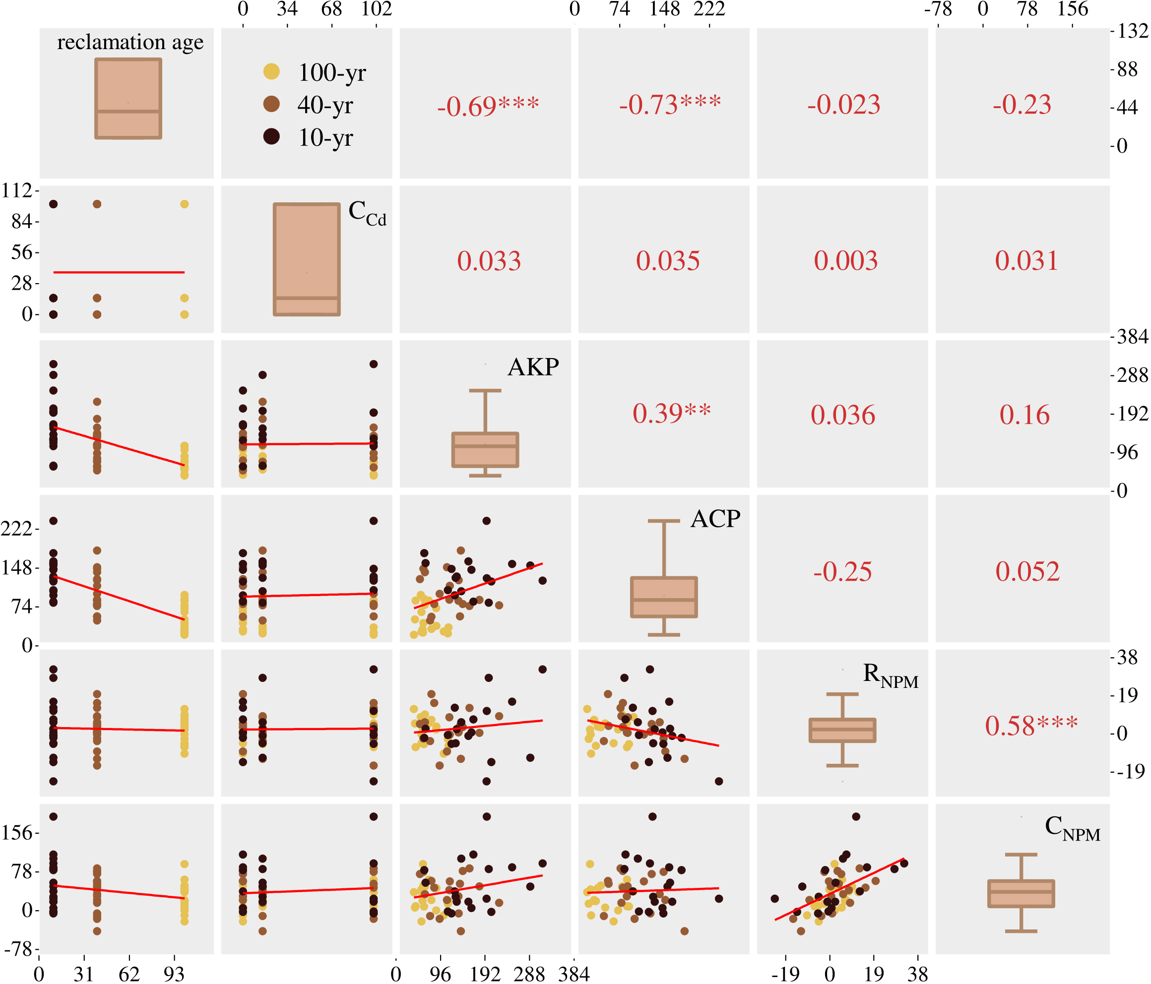 Spearman correlation analysis among Cd concentration, reclamation ages, ACP activity, ALP activity, CNPM and RNPM. Notes: Ccd, Cd addition dose. ***Significant correlation at P < 0.001 level. **Significant correlation at P < 0.01 level.