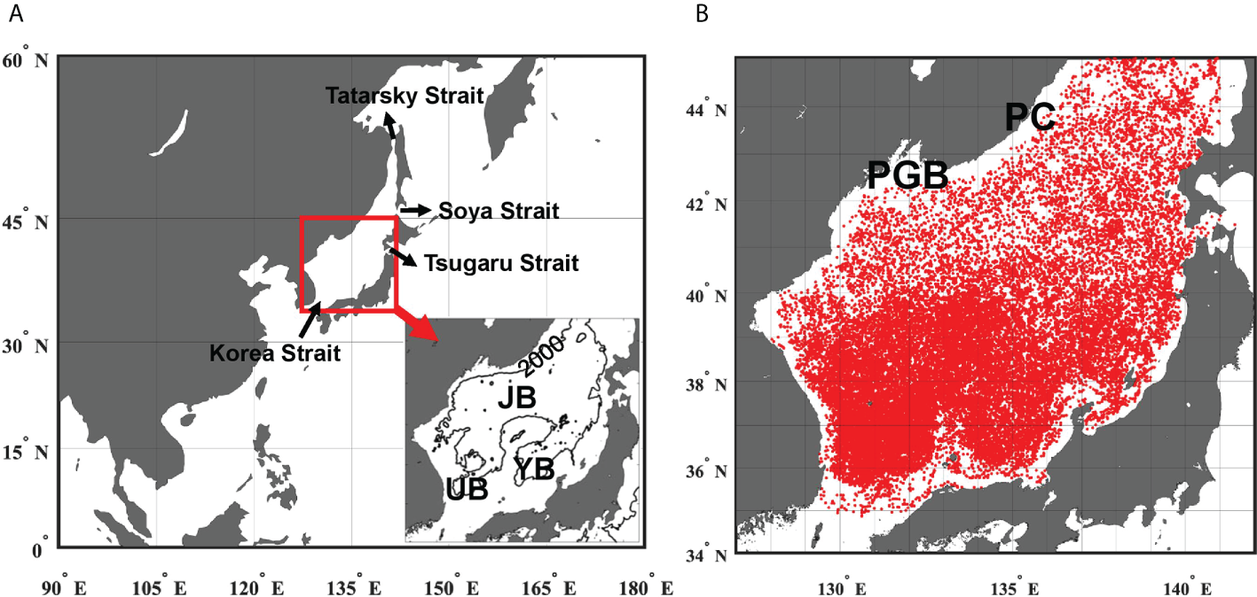 (A) Study region (red box) in the Northwestern Pacific. The black arrows indicate straits and their directions reflect schematic directions of surface current. The inset indicates the study region where the black contour denotes 2000 m isobath: JB, Japan Basin; YB, Yamato Basin; and UB, Ulleung Basin. (B) Station map shows locations of Argo float data from 2000 to 2020. The PGB and PC are abbreviations for the Peter the Great Bay and Primorye Coast, respectively.