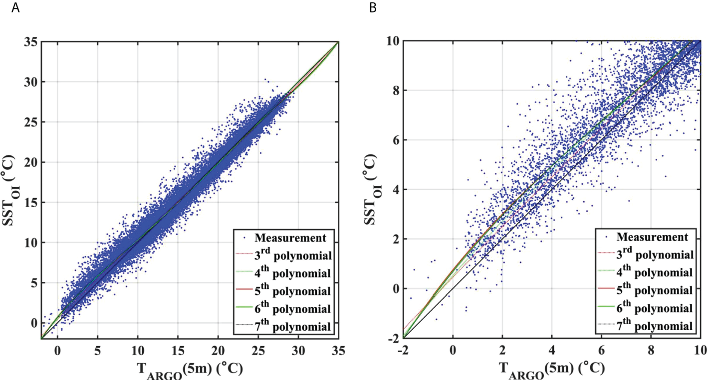 (A) Scatter plot of surface temperatures from Argo float data at 5 m (ARSST) and optimally interpolated sea surface temperature (OISST) at Argo data points. (B) Subplot of (A) for a temperature range of -2~10°C. Colored lines are nth polynomial fits.