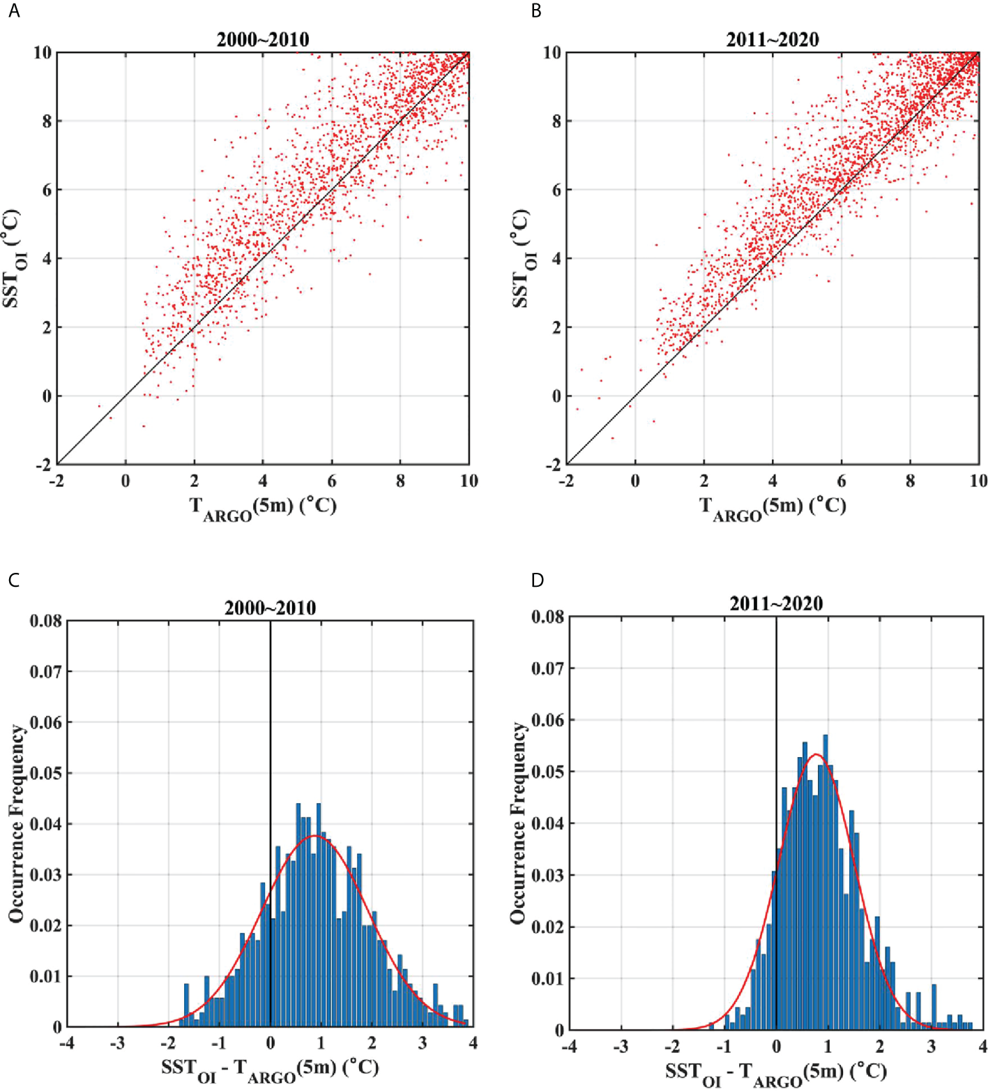 Surface temperatures from ARSST, and OISST at Argo data points ranging -2~10°C from (A) 2000–2010, (B) 2011–2020. (C, D) Frequency of differences between ARSST and OISST data for the temperature of less than 5°C in corresponding time ranges of (A, B), respectively. Red lines in (C) and (D) denote Gaussian functions fitted into each histogram.