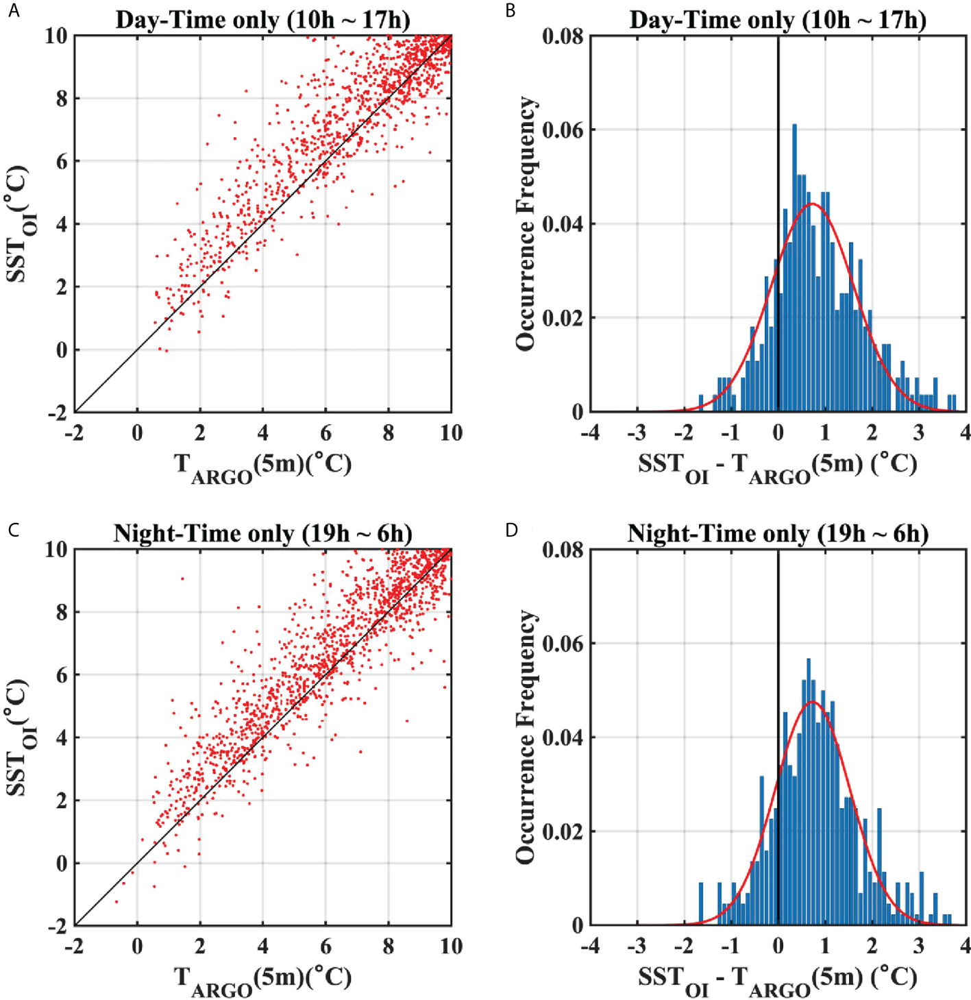 (A) Scatter plot of surface temperatures from ARSST, and OISST at Argo data points during day-time (10AM–5PM, local time). (B) Frequency of differences between ARSST and OISST data for a temperature range ofless than 5°C during day-time. (C) Same as (A), but for during night (7PM–6AM, local time). (D) Same as (B), but for during night-time.