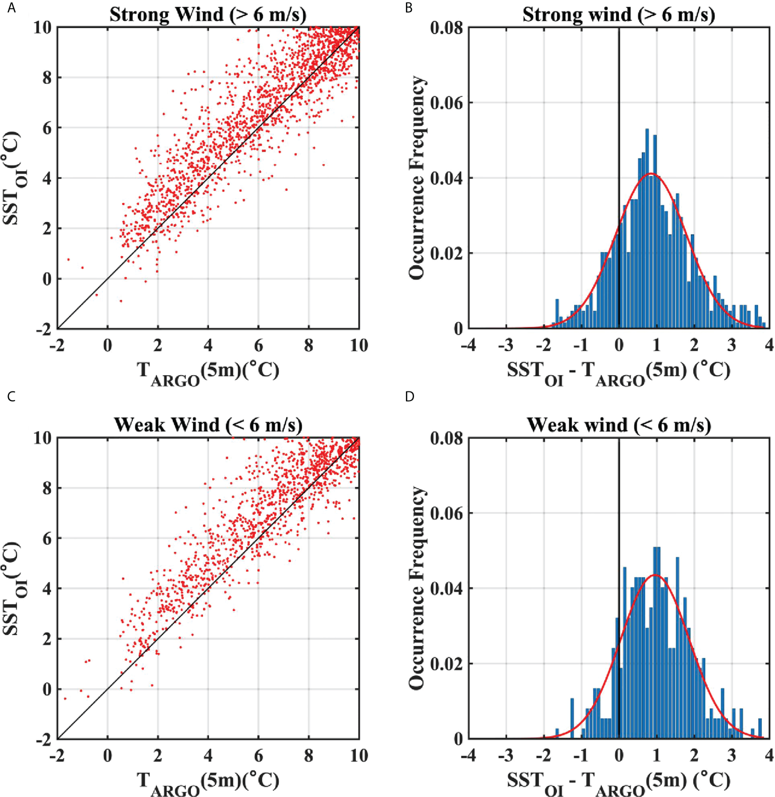 (A) Scatter plot of surface temperatures from ARSST, and OISST at Argo data points under strong wind (> 6m/s). (B) Frequency of differences between ARSST and OISST data for a temperature range of less than 5°C under strong wind. (C) Same as (A), but for under weak wind (< 6 m/s). (D) Same as (B), but for under weak wind.