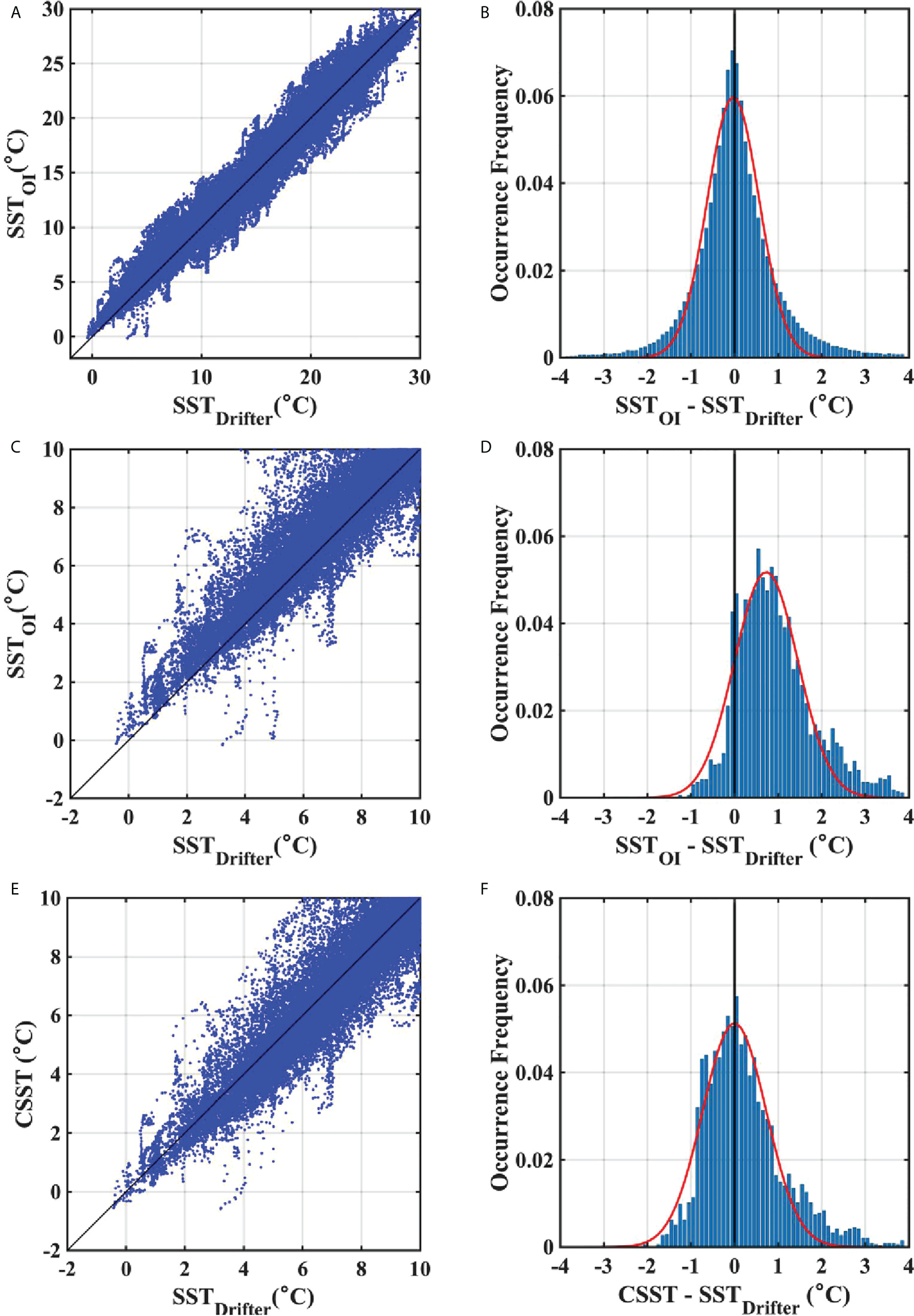 (A) Scatter plot of surface temperatures from surface drifters and OISST. (B) Frequency of differences between surface drifters and OISST data for the entire temperature range. (C) Subplot of (A) for a temperature range of -2~10°C. (D) Same as (B), but for a temperature range of less than 5°C. (E) Same as (C), but for corrected OISST. (F) Same as (D), but for corrected OISST.
