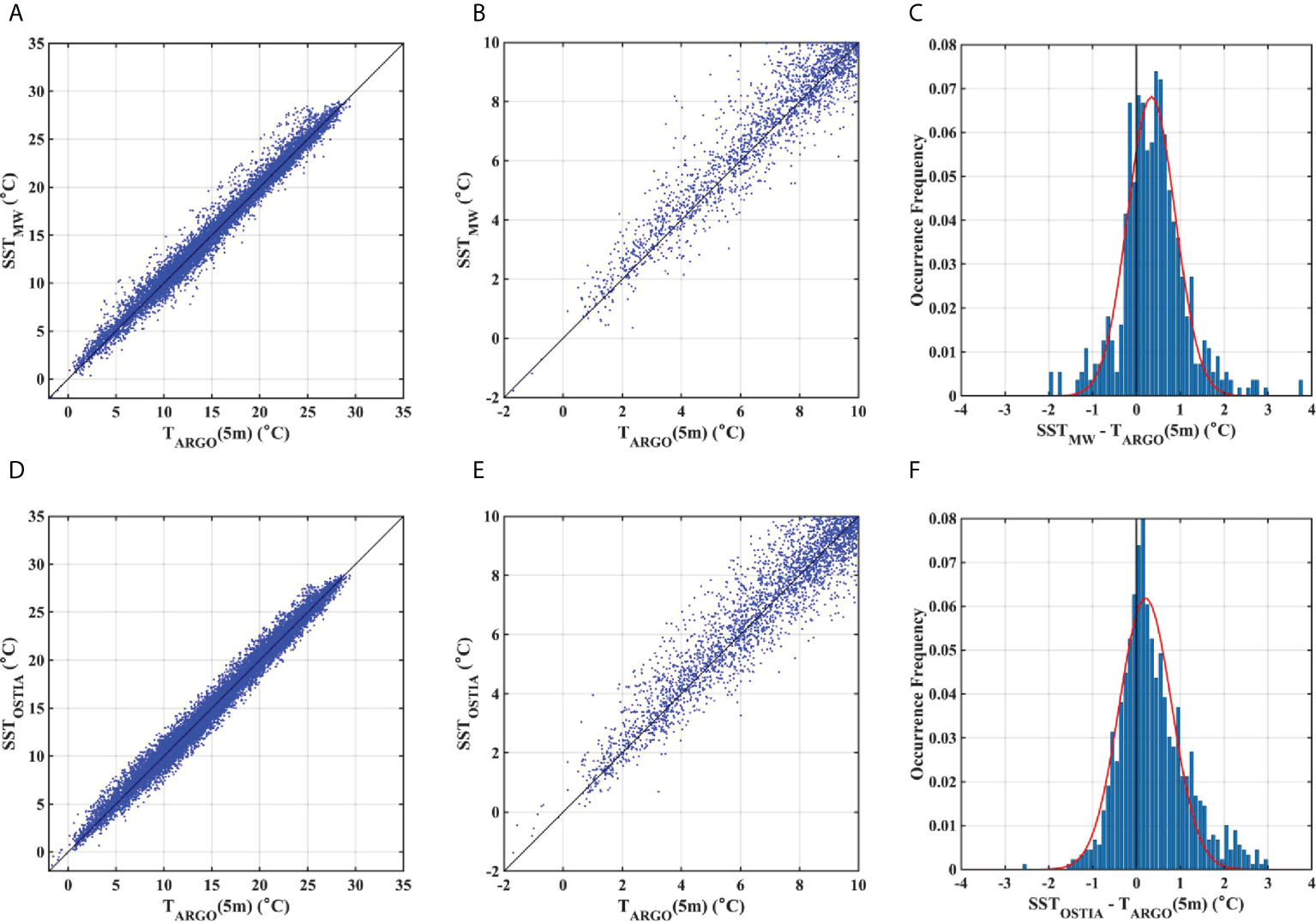 (A) Scatter plots of microwave-infrared SST (MWSST) vs ARSST, (B) Subplot of (A) for -2–10°C, and (C) Difference between MWSST and ARSST for less than 5°C. (D–F) same comparisons, but for daily operational SST and ice analysis (OSTIA) vs ARSST. Red lines in (C, F) depict Gaussian fits.