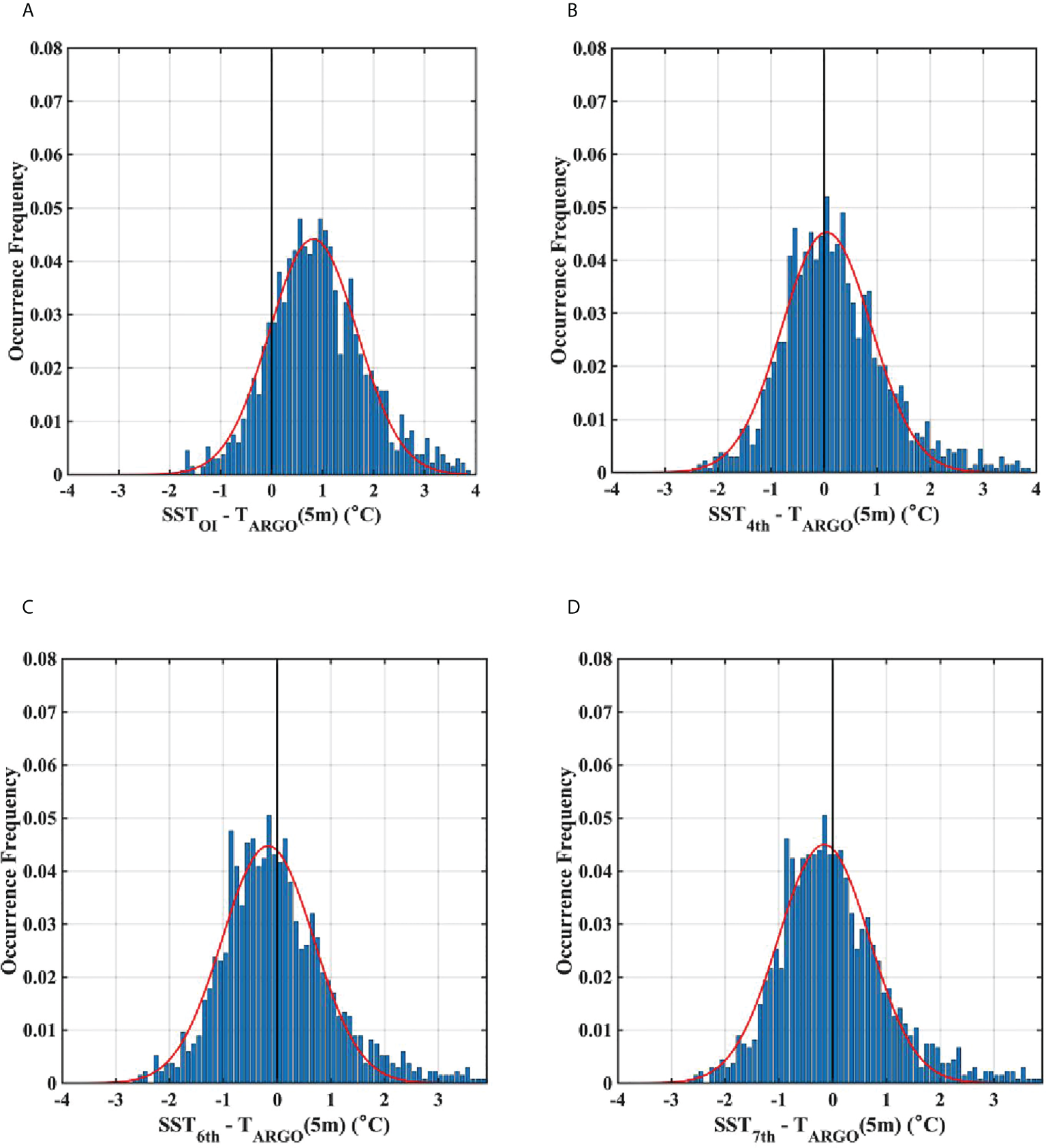 Differences between SST and ARSST for all temperature ranges (-2–25°C): (A) Original raw OISST data, (B) Corrected OISST (CSST) with the 4th, (C) 6th, and (D) 7th polynomial functions. Red lines denote Gaussian fits.