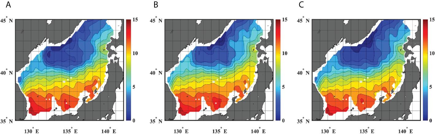 Surface temperatures from: (A) ARSST climatologically averaged for the winter (Jan.–Mar.) from 2000 to 2020, (B) OISST at Argo data points, and (C) CSST. Contour intervals are 1°C.