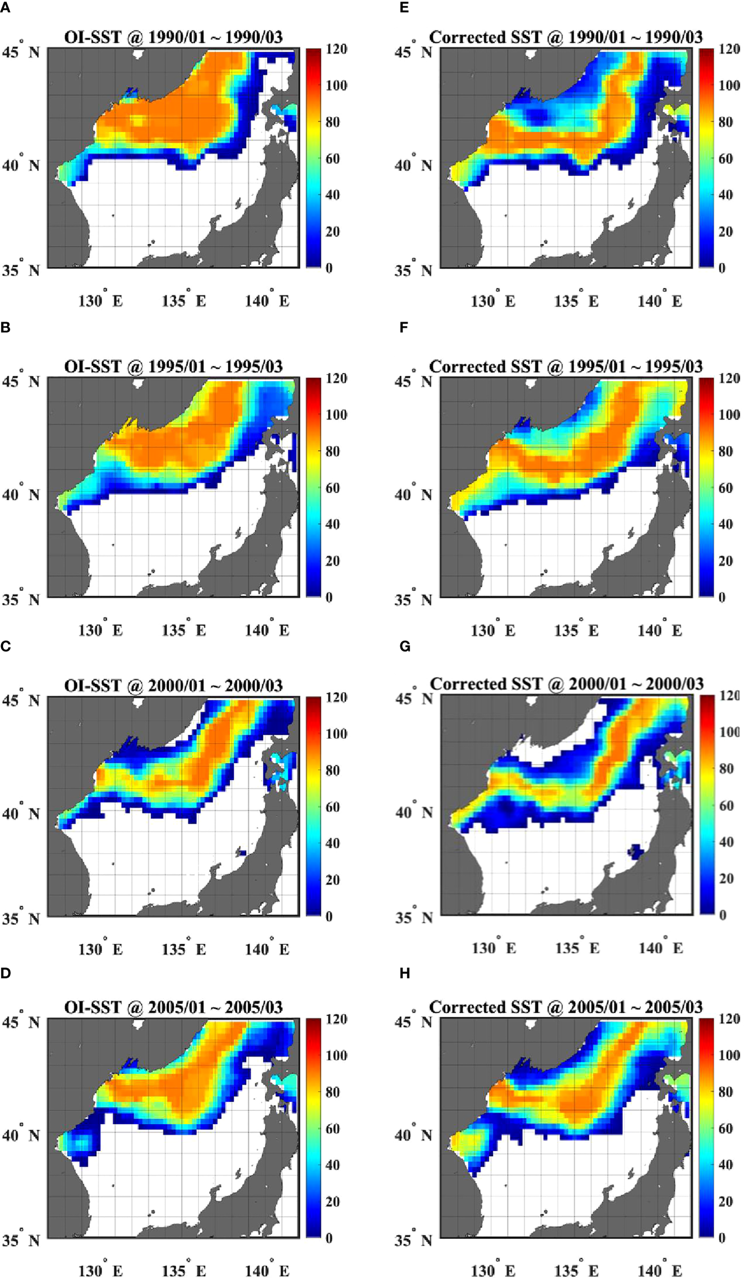 Firstly, CSSTs consistently exhibited higher chances of outcropping for the ESIW during the winter at the western JB, widely considered the formation site of the ESIW (40.5°–42° N, 130°–132° E; Park and Lim, 2018), than the warm biased OISSTs, as shown in the maps of day-counts where each grid had 1–5°C during the winters of 1990, 1995, 2000, and 2005 (Figure 11). Furthermore, before the correction, OISSTs showed higher winter outcropping probabilities of the ESIW off the Peter the Great Bay, and along the Primorye coast (Figures 11A–D). These areas are widely regarded as the formation sites of the ESCW and ESBW (< 1°C) through deep convections, rather than the ESIW (Talley et al., 2003; Yoon et al., 2018). Conversely, CSSTs displayed remarkably lower outcropping likelihoods of the ESIW in these locations, indicating that the overestimate of outcropping probabilities of the ESIW in the northernmost ES was successfully adjusted through warm bias correction (Figures 11E–H).