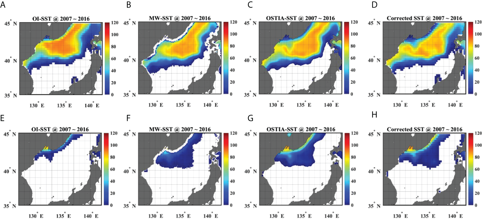 Average day-counts of 1–5°C outcropping in winter (Jan.–Mar.) from 2007–2016 for (A) OISST, (B) MWSST, (C) OSTIA, and (D) CSST. Average day-counts of less than 1°C outcropping for (E) OISST, (F) MWSST, (G) OSTIA, and (H) CSST. Units are days.