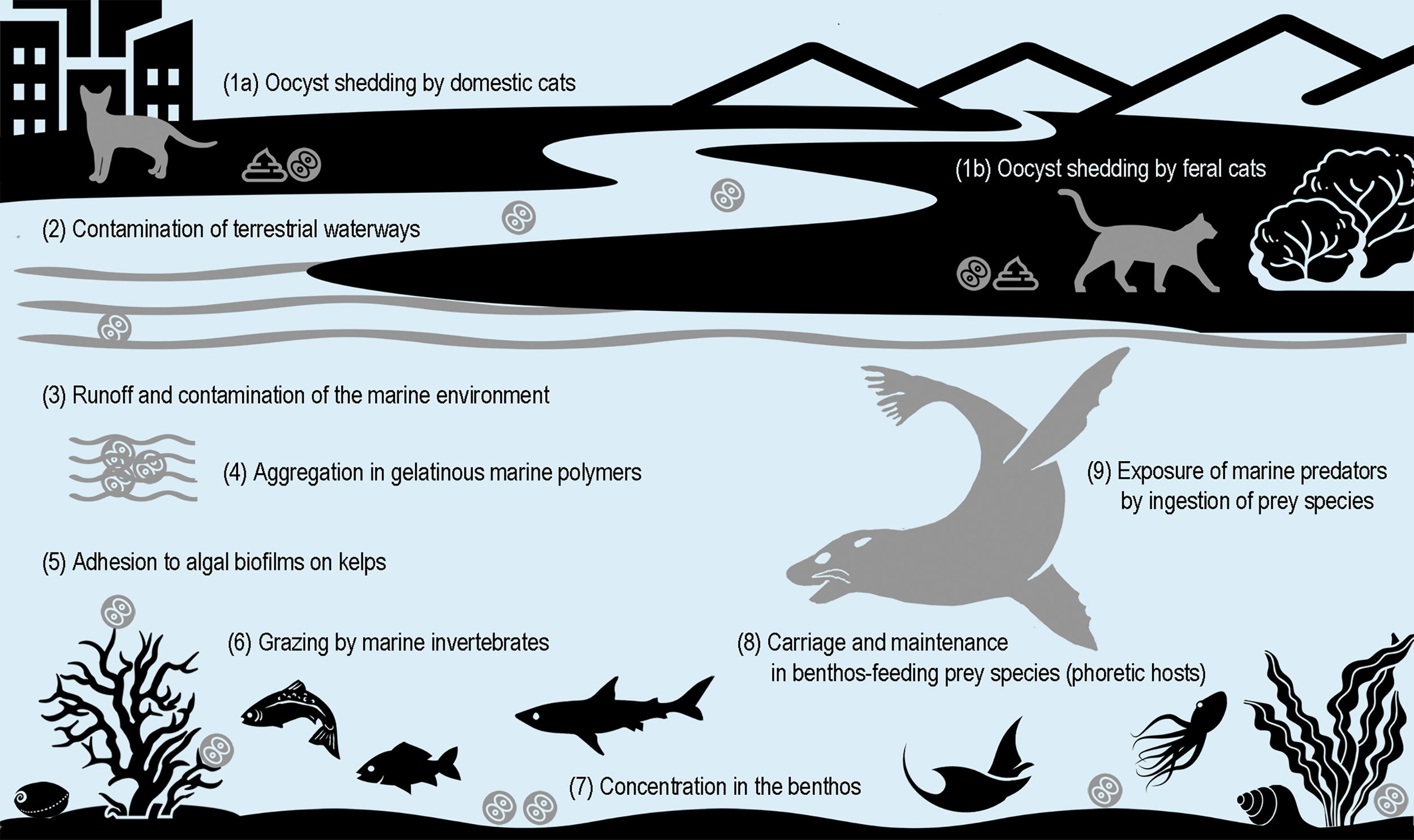 The infection of marine mammals indicates contamination of coastal and marine environments with oocysts shed in cat feces, by terrestrial water run-off or from ocean sewage discharge (Miller et al., 2002; Fayer et al., 2004) (Figure 1). For species frequenting coastal habitats, such as pinnipeds, infection could also result from direct contamination of haul out sites by cat feces. In any case, infection is most likely to result from oocyst (versus tissue cyst) ingestion, given the cold-blooded nature of their prey species (e.g., fish and marine invertebrates) precludes susceptibility to active T. gondii infection. Oocysts are environmentally resistant, capable of sporulation (becoming infectious) and temperature-dependent maintenance of infectivity in sea water for at least 6-24 months (Lindsay et al., 2003; Lindsay and Dubey, 2009). Increased exposure of marine mammals is likely facilitated by parasite carriage and maintenance of viability in cold-blooded prey species acting as phoretic hosts – including filter-feeding bivalve mollusks (e.g., blue (Mytilus edulis) (Bigot-Clivot et al., 2022) and green-lipped (Perna canaliculus) mussels (Coupe et al., 2018)) and fish species (Marino et al., 2019), the latter already a suggested source of infection for coastal and pelagic seabirds (Poulle et al., 2021; Campbell et al., 2022). Independent of prey species, the initial entry of the parasite into the marine food chain is likely enabled by aggregation in gelatinous marine polymers and by adhesion to algal biofilms on kelps grazed by marine invertebrates (Shapiro et al., 2014).