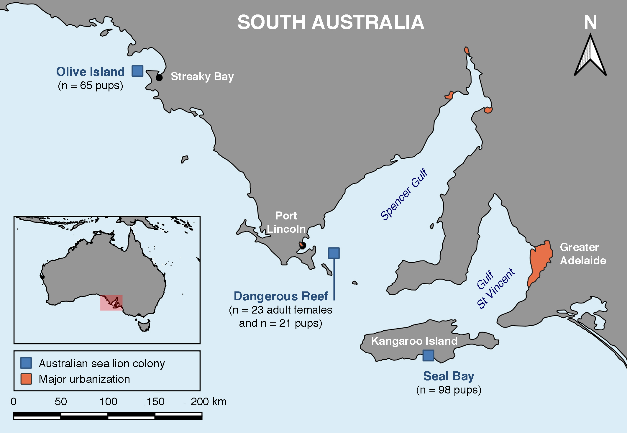 Sample collection dates for Dangerous Reef (n = 21), Olive Island (n = 65) and Seal Bay (n = 126) were 21 July to 29 August 2017, 15 to 19 September 2017, and 5 March to 8 May 2018, respectively. Serum was separated within 12 h of blood collection after centrifuging plain blood tubes for 2 min at 13,700 g (StatSpin MP, StatSpin Technologies, Norwood, USA). Samples were stored in the field in liquid nitrogen (Dangerous Reef and Olive Island) or frozen at -20° C (Seal Bay), before longer term freezing at -80° C.