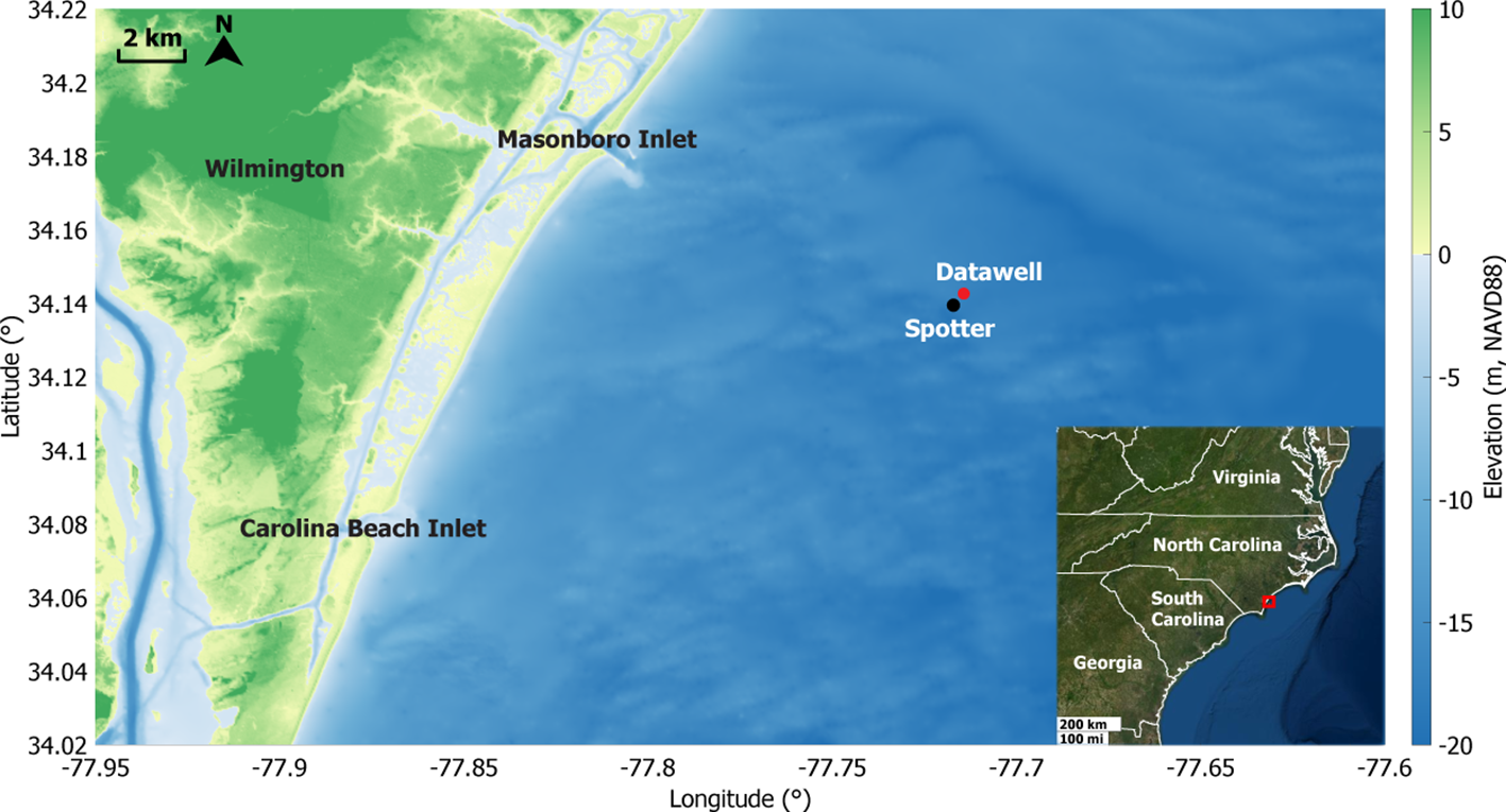 Location of the Datawell and Spotter wave buoys offshore of Masonboro Inlet, North Carolina.