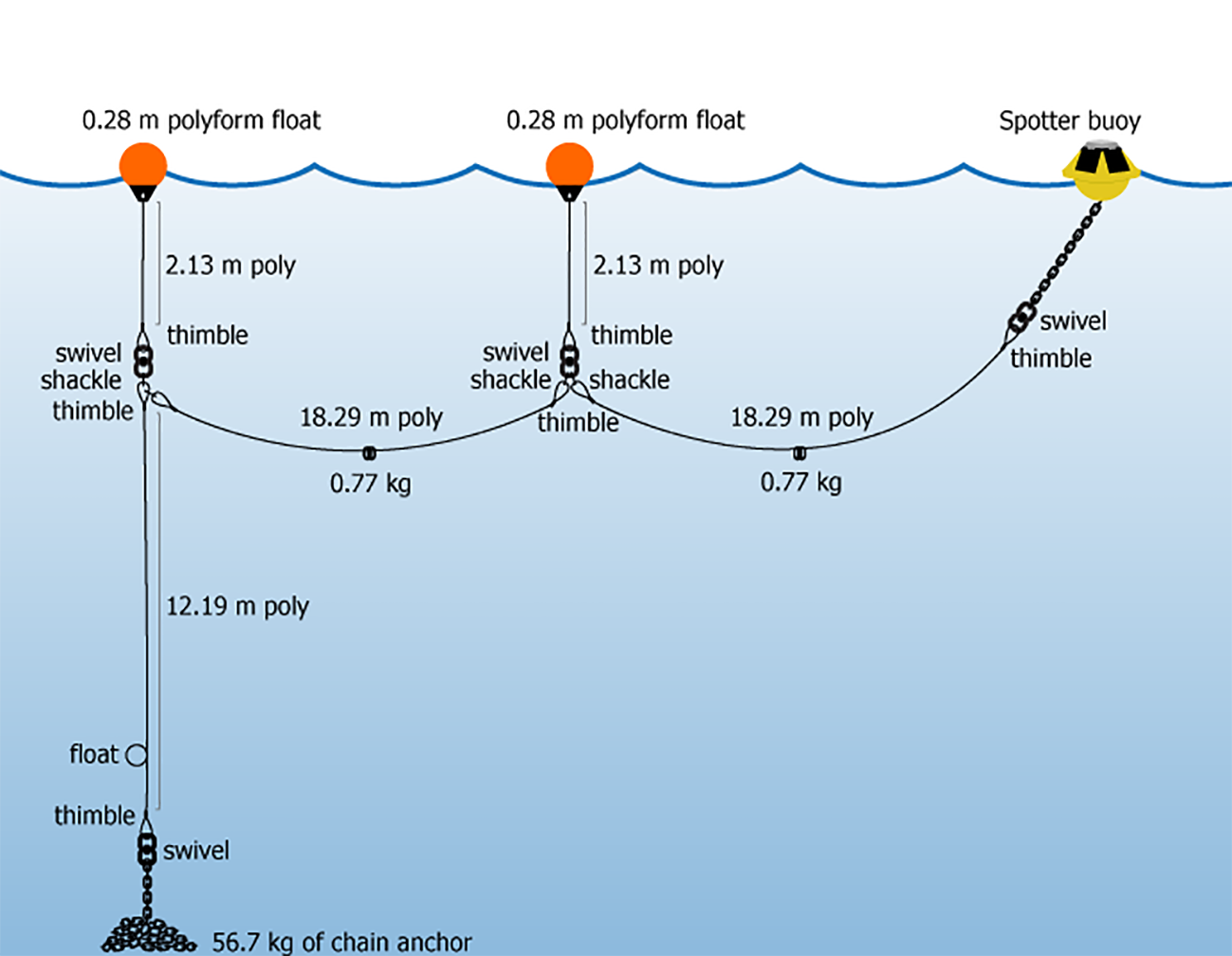 The Spotter was deployed ~190 m apart from a collocated Datawell and meteorological buoy located ~9.8 km offshore of Masonboro Inlet, North Carolina in 15.2 m (NAVD88) water depth (Figure 1). The Datawell and meteorological buoys are operated by the Coastal Ocean Research Monitoring Program (CORMP) and are used as the controls in this study. The mooring configuration for the Spotter utilized two surface floats with a mooring line length (polypropylene rope) of ~36 m (Figure 2). The Datawell mooring configuration utilized two neutrally buoyant floats with a mooring line (rubber cord) length of ~30 m.