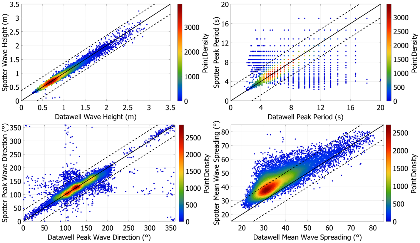 Density scatter plots of significant wave heights (top left), peak periods (top right), peak wave directions (bottom left), and mean wave spreading (bottom right) values reported by the Datawell and Spotter wave buoys. The solid black line through the origins shows a 1:1 relationship between the two buoys; the dashed black lines show one standard deviation for the Datawell from the 1:1 line.