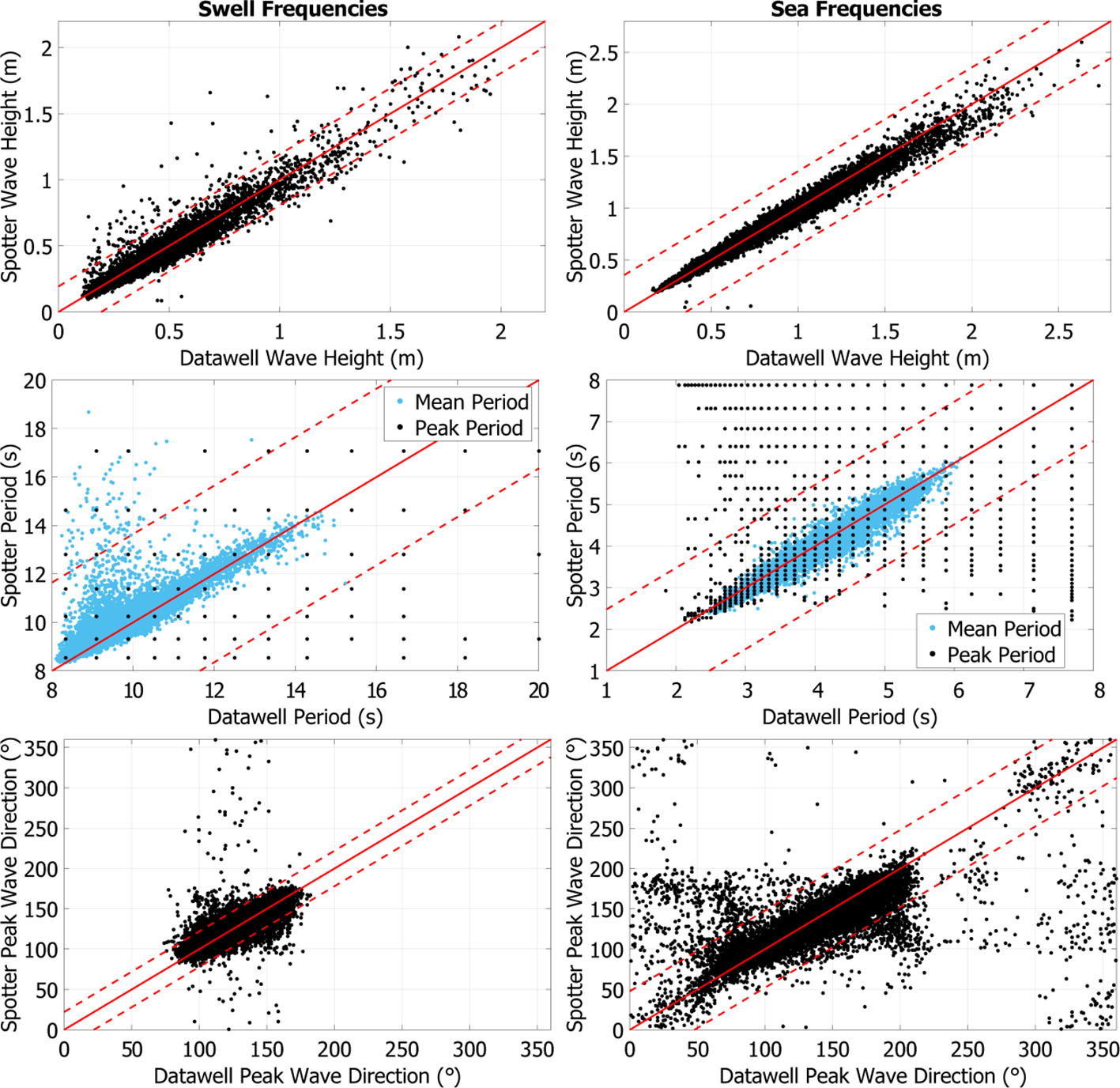 Separating the wave spectra into swell and sea partitions further indicated proficiency of the Spotter Buoy in recording significant wave height with low error in both swell and sea frequencies. While there is large scatter in comparisons of peak period, mean wave periods, an integrated metric, provides a more robust comparison and shows agreement between the buoys with little bias. There is some scatter in the swell components where the Spotter buoy overestimates the mean period, but this is limited with 95% of Spotter calculated mean periods falling within 1 standard deviation of Datawell calculated mean periods in the swell frequency range (center left panel of Figure 5). Error in the mean directional spread was similar for both swell and sea frequencies with the Spotter Buoy overestimating the directional spread.