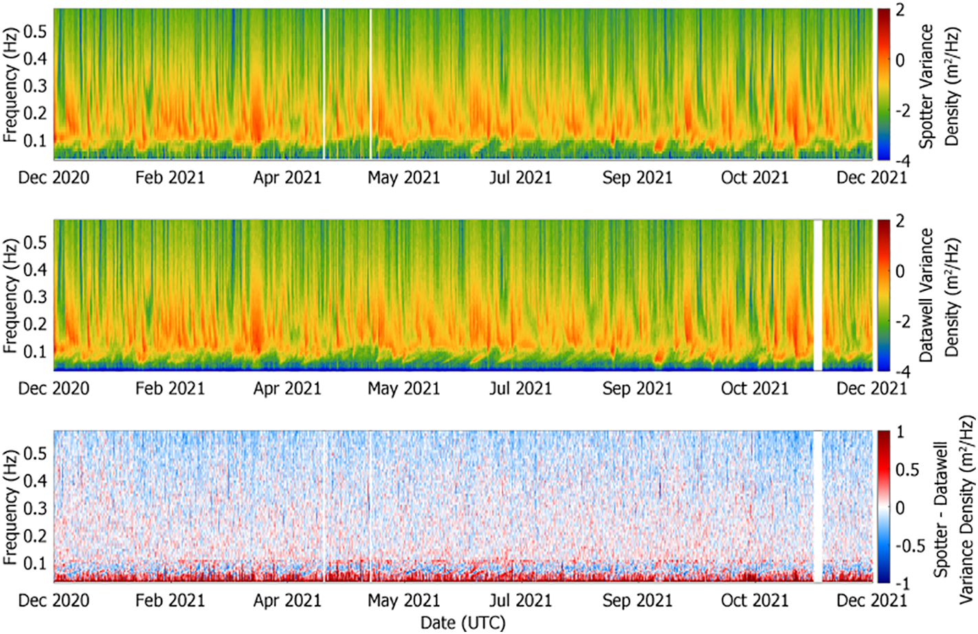 Time series displaying wave energy against frequency recorded by the Spotter (top) and Datawell (center) wave buoys on a log scale.