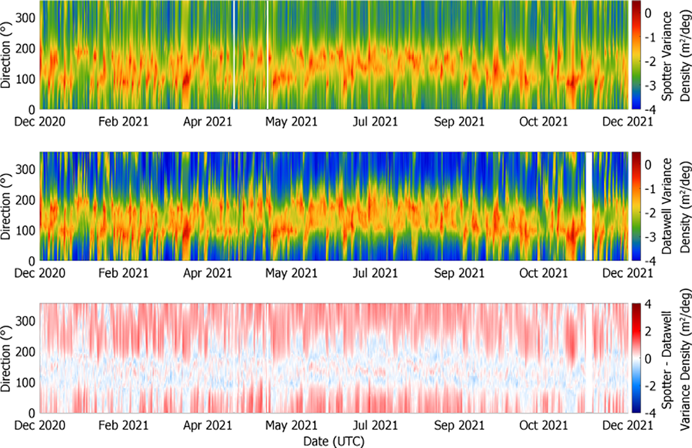 Time series displaying wave energy against direction recorded by the Spotter (top) and Datawell (center) wave buoys on a log scale.