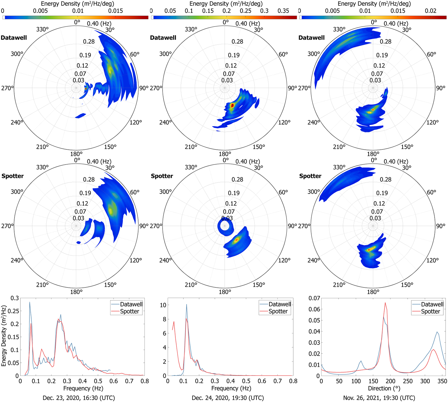 Comparison of the directional distribution of wave energy for the Datawell (top row) and Spotter (middle row) wave buoys for the three time periods shown in Table 2. The bottom left and bottom center panel show energy density versus frequency for the two buoys, the bottom right panel shows energy density versus direction for the two buoys.