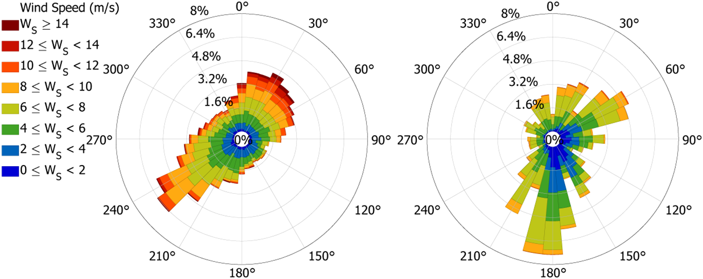 Comparison of wind roses for the meteorological buoy (left) and Spotter buoy (right).