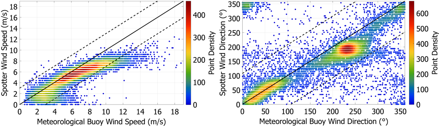 Density scatter plots of wind speed (left) and wind direction (right) recorded by the meteorological buoy and Spotter wave buoy. The solid black line through the origins shows a 1:1 relationship between the two buoys; the dashed black lines show one standard deviation for the meteorological buoy from the 1:1 line.