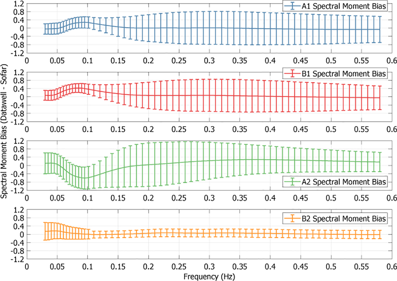 Biases of each spectral moment between the two wave buoys for each frequency band during the duration of the study. The error bars show the bias standard deviation for the spectral moments in each frequency band.