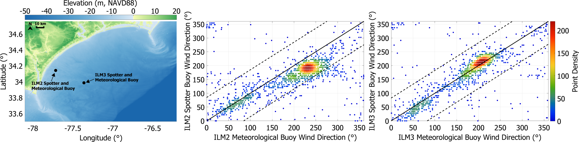 Locations of the two Spotter buoys and associated meteorological buoys (left), and density scatter plots comparing Spotter buoy derived wind directions to wind directions recorded by the nearest meteorological buoy. The solid black line through the origins shows a 1:1 relationship between each compared buoy; the dashed black lines show one standard deviation for the meteorological buoys from the 1:1 line.