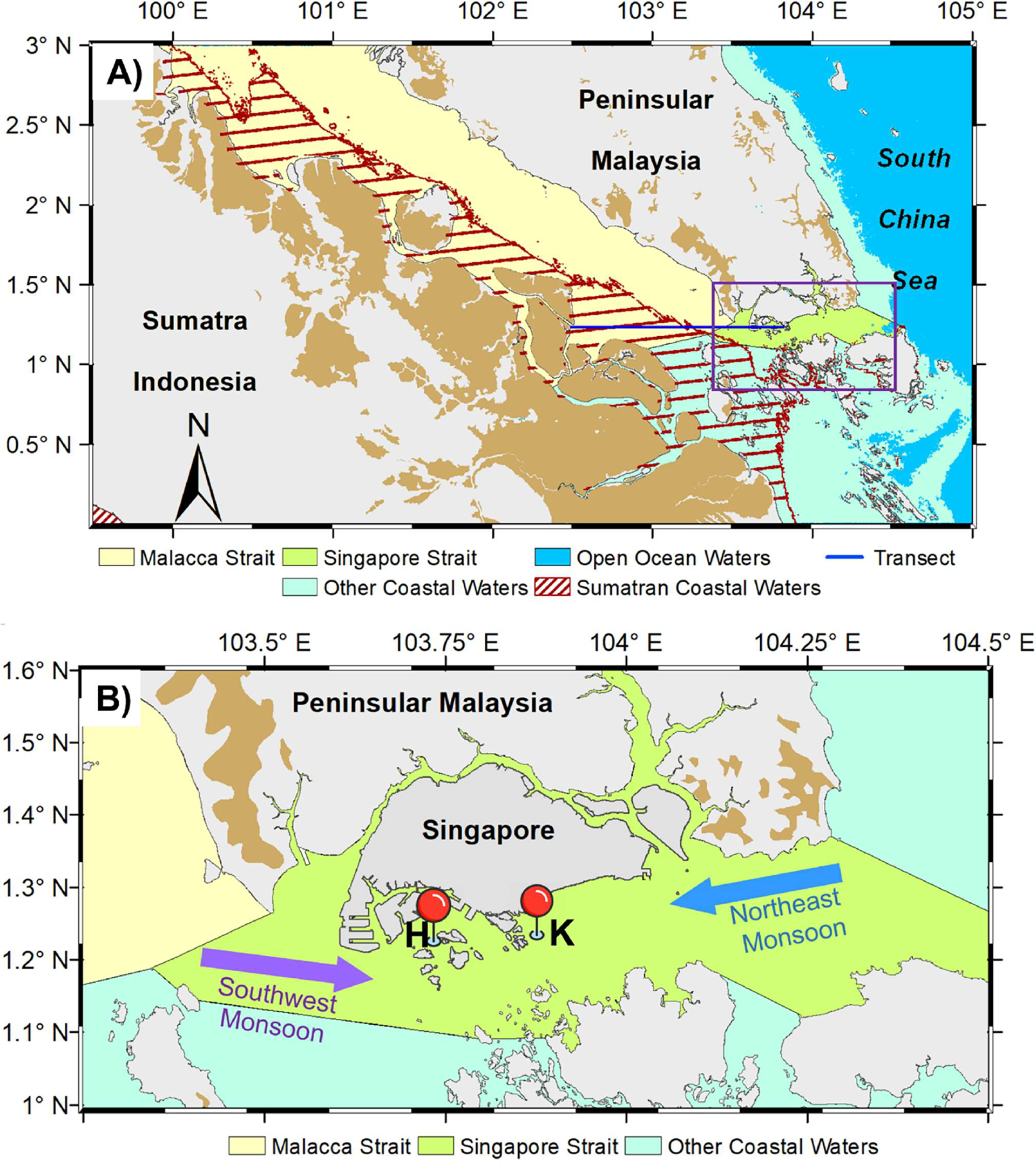 (A) Map of the study region showing the location of peatlands (brown in shading) and the delineation of water bodies across the Sunda shelf of Southeast Asia. The blue color line shows the transect from Sumatran coastal waters to Singapore Strait (latitude=1.24°CN. The purple box corresponds to the area shown in (B). (B) The two main sampling sites in the Singapore strait waters are shown by red push pin indicators: the eastern site, Kusu (K) Kusu and western site Pulau Hantu (H). Purple and blue arrows show the mean current direction during each monsoon season.