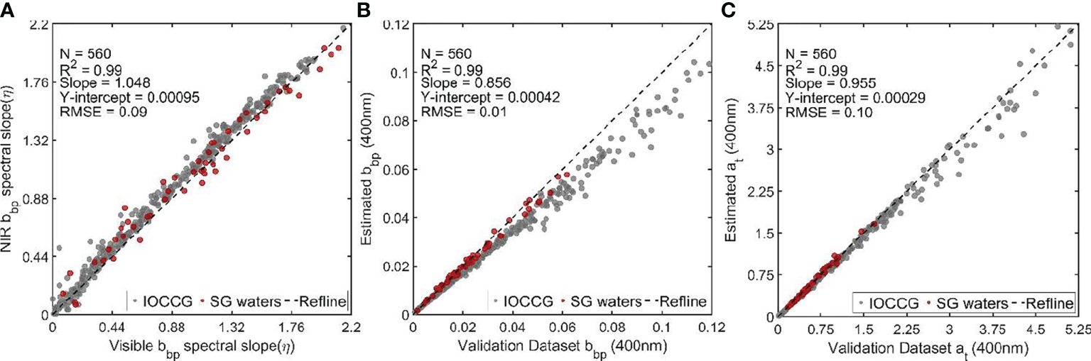 The performance of the algorithm for the simulated IOCCG and in situ S.G. dataset was evaluated individually (Supplementary Table S1) and as a combined-IOCCG+SG dataset (Figure 2). A high coefficient of determination (R2, combined=0.99, S.G. = 0.99, IOCCG=0.99) signifies a strong correlation between the (Shi and Wang, 2019) defined NIR-based spectral slope η(779-865nm) and (IOCCG, 2006) defined visible spectral slope η(400-700nm). A lower value of root means square error, (RMSE, combined=0.09, S.G =0.09, IOCCG=0.09) in synergy with the slope values close to 1 (combined=1.048, S.G. = 0.981, IOCCG=1.07) indicates that the NIR-based spectral slope η(779-865nm) can be used to derive bbp(λ) in the visible bands for both the IOCCG and S.G. datasets. A high level of accuracy was observed between blended QAA derived at(400) and counterparts (Figure 2B, Supplementary Table S1) from the validation dataset (combined R2 = 0.99, S.G. R2 = 0.99, IOCCG R2 = 0.99) with a lower value of RMSE (combined=0.1 m-1, S.G. = 0.03 m-1, IOCCG=0.1m-1) in synergy with the slope values close to 1 (combined=0.955, S.G. = 1.04, IOCCG=0.955). Similarly, high R2 = 0.99 (combined), low RMSE ≤ 0.01 m-1, and slope value of 0.86 for bbp(400nm) indicates that the algorithm is robust and can be used to derive IOPs for turbid waters (Figure 2C, Supplementary Table S1). However, as the combined dataset is overwhelmed by the IOCCG data (N=500), the combined statistical relations and fits follow the IOCCG simulated data. Following (Shi and Wang, 2019), at(λ) is then decoupled into aph(λ) and adg(λ) according to Lee’s QAA algorithm (Lee et al., 2005) with the empirical approach relating at(λ), and rrs(λ) at the blue and green bands (see Supplementary Information 3-Decoupling total absorption at(λ) according to Lee’s QAA).