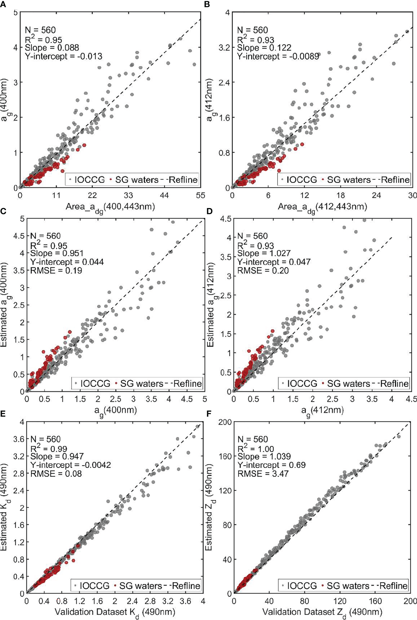 Comparison plots of (A) area under the adg spectral curve and ag(400nm). (B) area under the adg spectral curve and ag(412nm). (C) IOCCG+SG quantified and area-based estimations of ag(400nm). (D) IOCCG+SG quantified and area-based estimations of ag(412nm). (E) Kd (490) derived from IOPs using blended QAA and IOCCG+SG. (F) Zd(490nm) derived from IOPs using blended QAA and IOCCG+SG.