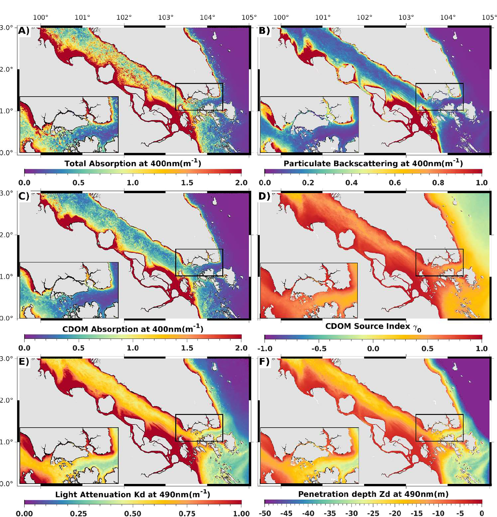Spatial distribution of the 2017–2020 mean values of blended QAA derived optical properties (A) Total absorption coefficient of light (at) at 400 nm. (B) Particulate backscattering (bbp) at 400nm. (C) CDOM absorption coefficient (ag) at 400 nm. (D) CDOM source index, γ0 (values ≥0.5 indicate the increasing dominance of terrigenous origin of CDOM over marine) (E) Diffuse attenuation coefficient of light (Kd) at 490 nm. (F) Depth of penetration of light at 490 nm (Zd, 1% of the surface value). The black box corresponding to the Singapore Strait area is shown in the left corner of each image.
