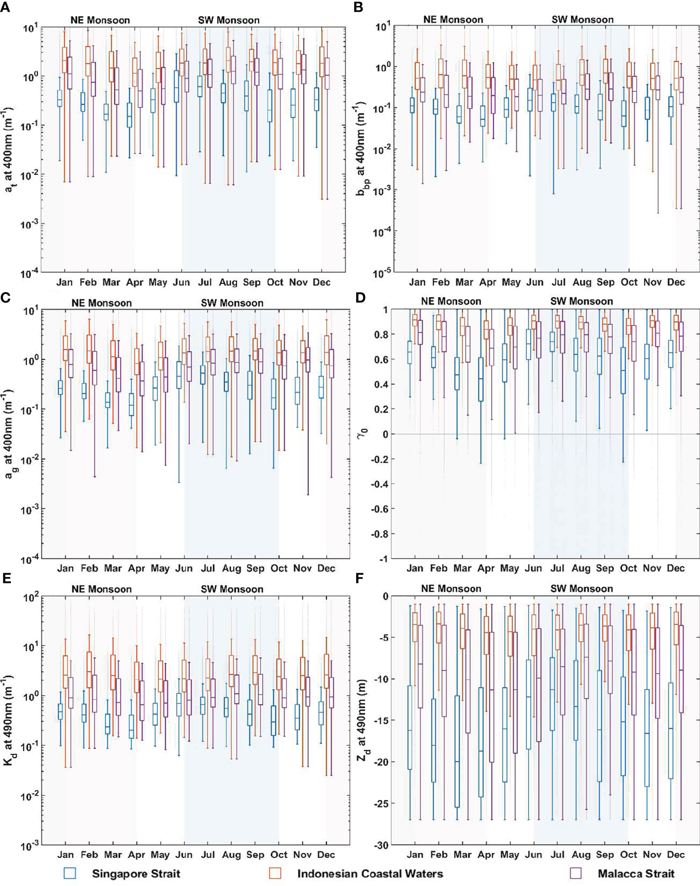 Box plots of monthly mean (2017-2020) values of bio-optical parameters across Singapore Strait, Malacca Strait, and Sumatran Coastal waters defined in Figure 1. Bio-optical parameters derived from Sentinel OLCI were (A) Total absorption coefficient of light (at) at 400 nm. (B) Particulate backscattering (bbp) at 400nm. (C) CDOM absorption coefficient (ag) at 400 nm. (D) CDOM source index, γ0 (values ≥0.5 indicate the increasing dominance of terrigenous CDOM over CDOM of marine origin). (E) Diffuse attenuation coefficient of light (Kd) at 490 nm. (F) Depth of maximum penetration of light at 490 nm (Zd, 1% of the surface value). Box plot for the offshore marine waters is avoided here due to relatively lower and stable values of all the parameters.