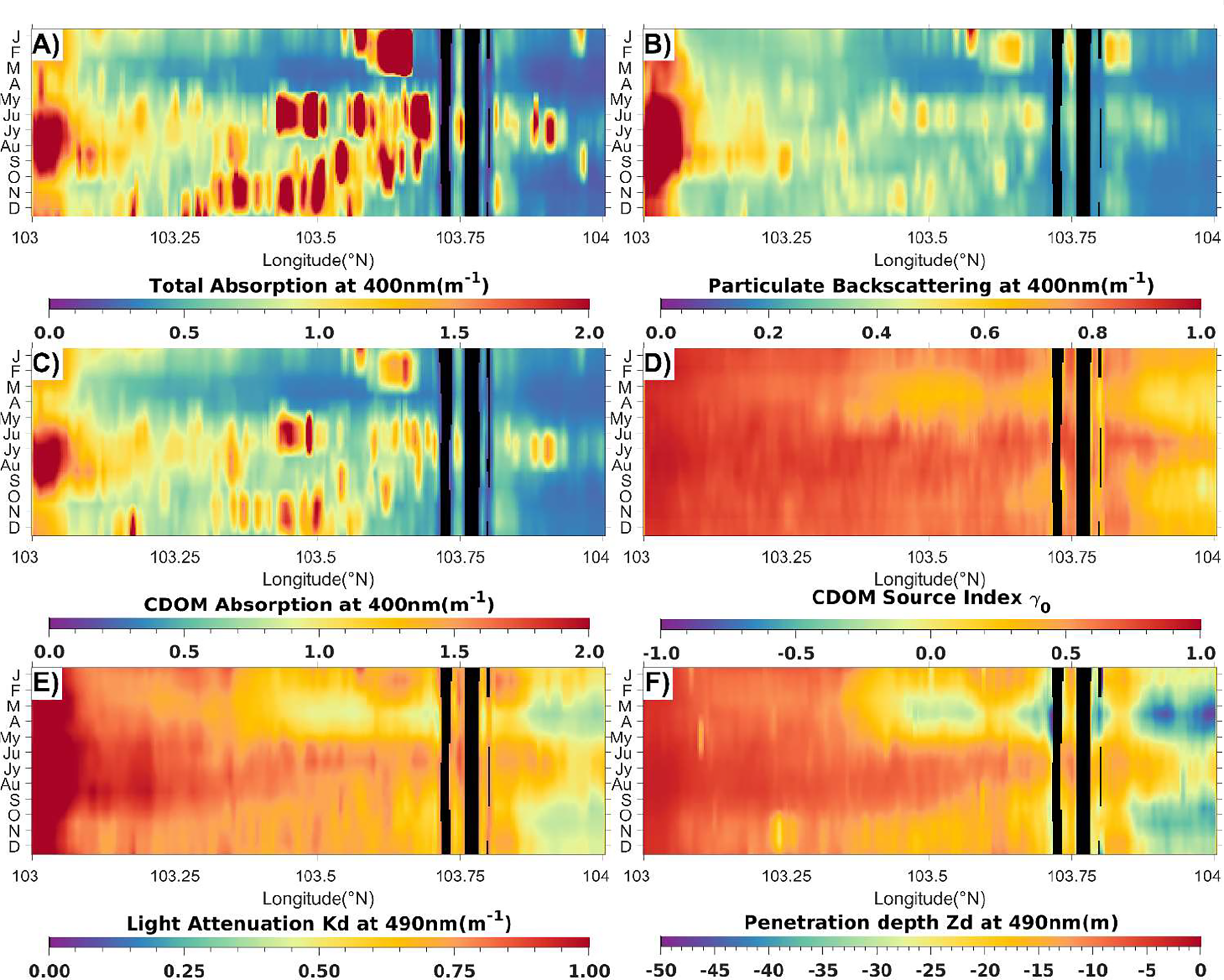 Transect from Sumatran coastal waters to Singapore Strait (latitude=1.24°CN) for monthly averaged (2017-2020) optical properties (A) Total absorption coefficient of light (at) at 400 nm. (B) Particulate backscattering (bbp) at 400nm. (C) CDOM absorption coefficient (ag) at 400 nm. (D) CDOM source index, γ0.(E) Diffuse attenuation coefficient of light (Kd) at 490 nm. (F) Depth of maximum penetration of light at 490 nm (Zd, 1% of the surface value). The figure displays the transport of organic matter rich and sediment-laden waters from the Sumatran coast to Singapore Strait during the Southwest monsoon (June-September).