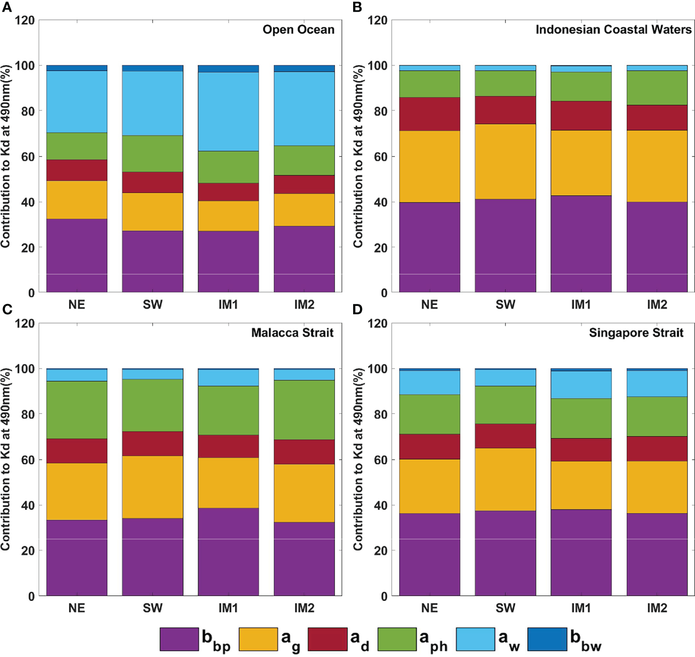 Relative contribution of bio-optical components to diffuse attenuation coefficient of light (Kd) at 490 for (A) Open Ocean waters, (B) Indonesian coastal waters, (C) Malacca Strait, and (D) Singapore Strait defined in Figure 1. Relative contribution is computed seasonally for absorption coefficient of water (aw) at 400 nm, CDOM absorption coefficient (ag) at 400 nm, detritus absorption coefficient (ad) at 400 nm, phytoplankton absorption coefficient (aph) at 400 nm, particulate backscattering (bbp) at 400nm, and backscattering by water (bbw) at 400nm.