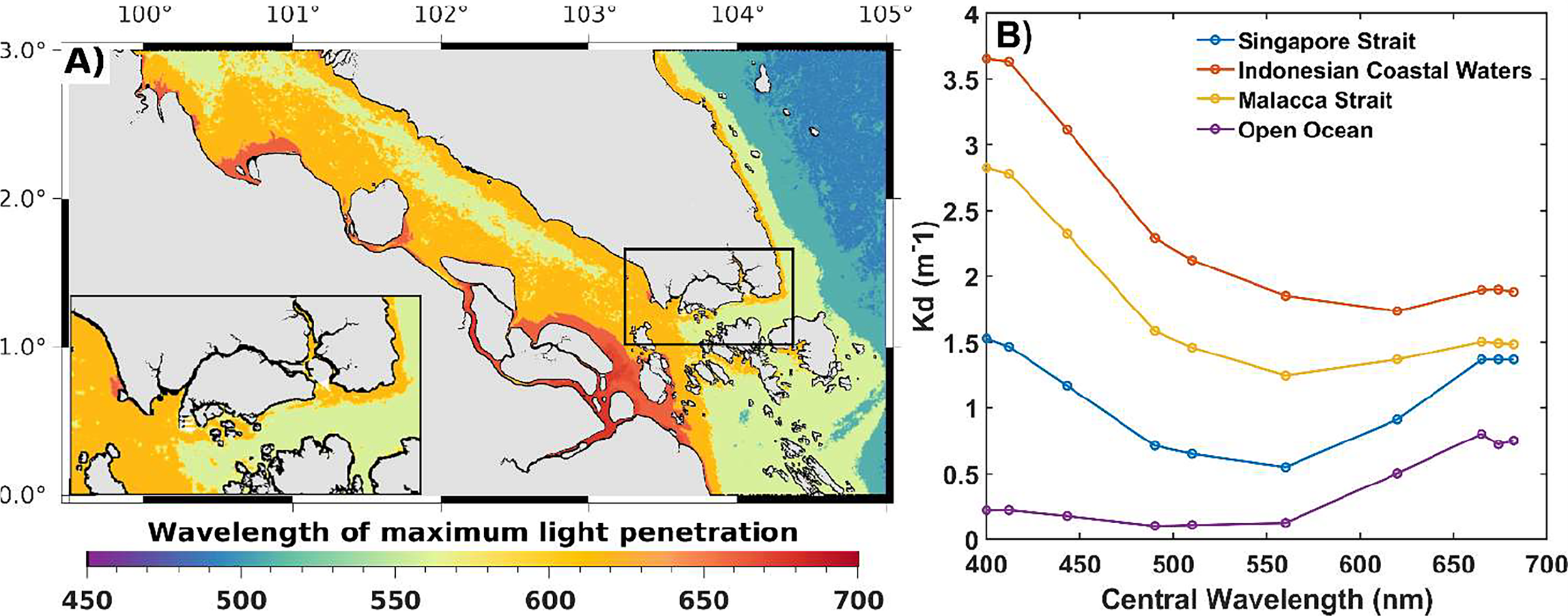 Spectral quality of light in the water column. (A) Spatial distribution of the mean value (2017–2020) of the central wavelength at maximum penetration of light. (B) Spectral distribution of light across Singapore Strait, Malacca Strait, Open Ocean, and Sumatran Coastal waters.