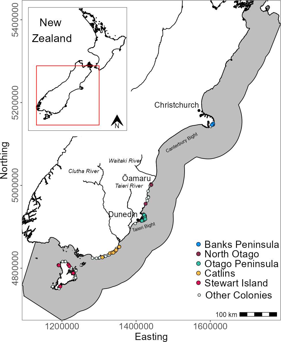 Distribution of breeding colonies across the South Island and Stewart Island, New Zealand and the GPS foraging trip data used in this study. Tracks and colonies are coloured by region. White circles denote colonies with at least one confirmed nest since 2003 but with no GPS tracking data. The grey area is the study extent.